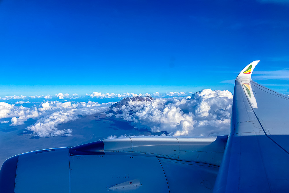 ... nach einer engen Schleife gewinnt das Flugzeug Höhe und - siehe da - der Kilimandscharo wird heute sichtbar.