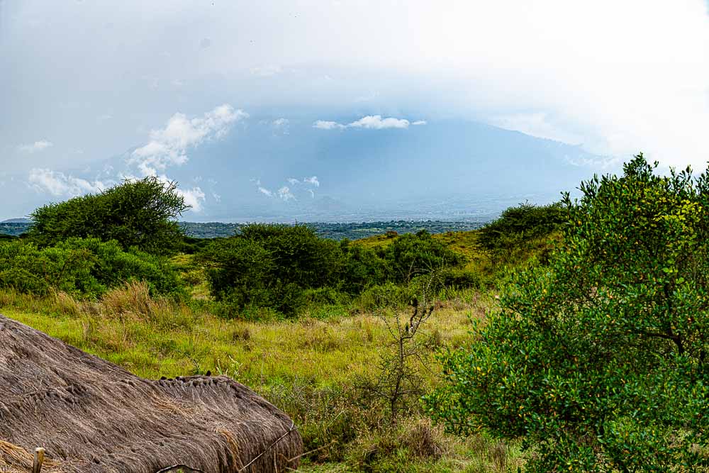 Regenschauer beim Mount Meru, unterhalb die Häuser von Arusha.