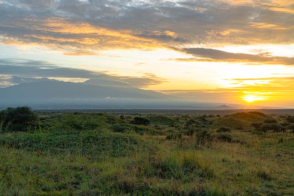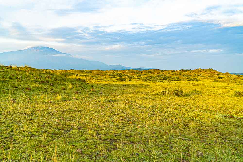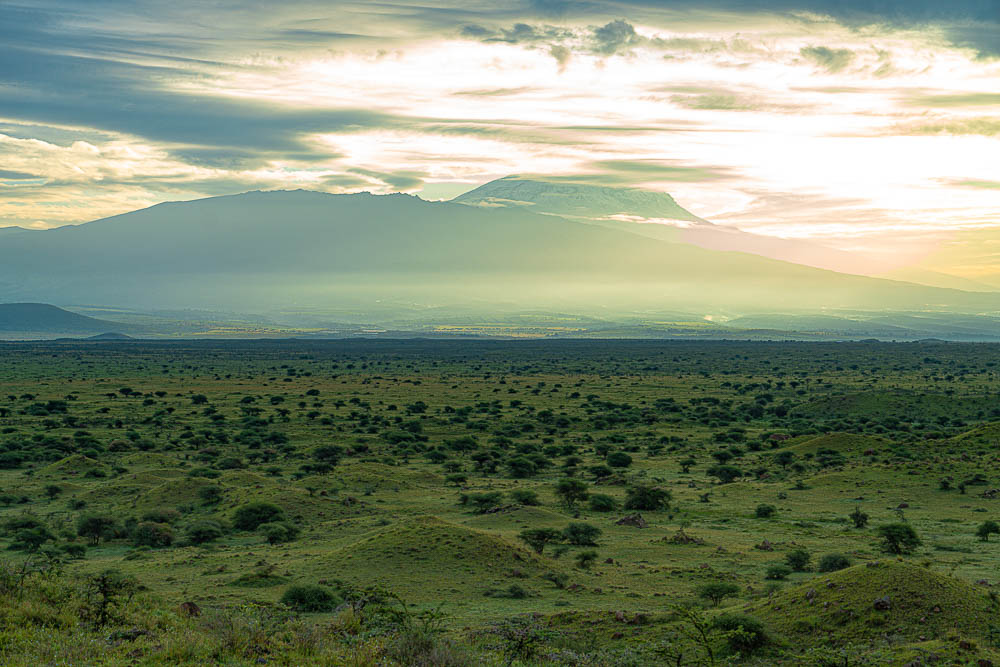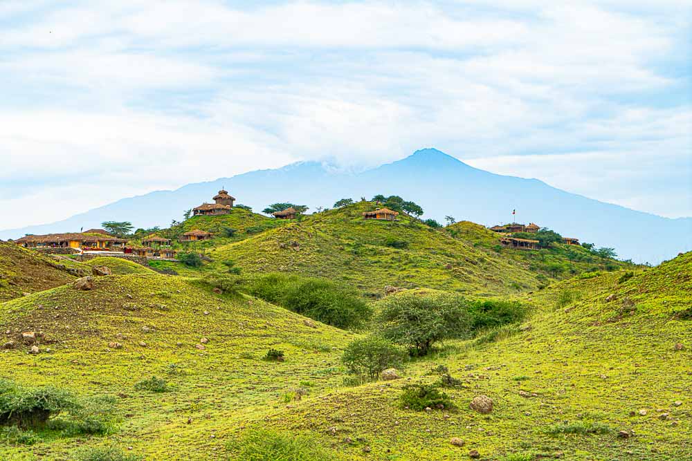 Die Original Maasai Lodge, am Ende eines Höhenrückens mit atemberaubendem Blick zu Mount Meru und Kilimandscharo, möglicherweise auf dem Ende eines alten, verwitterten Lavastroms vom Mount Meru erbaut.