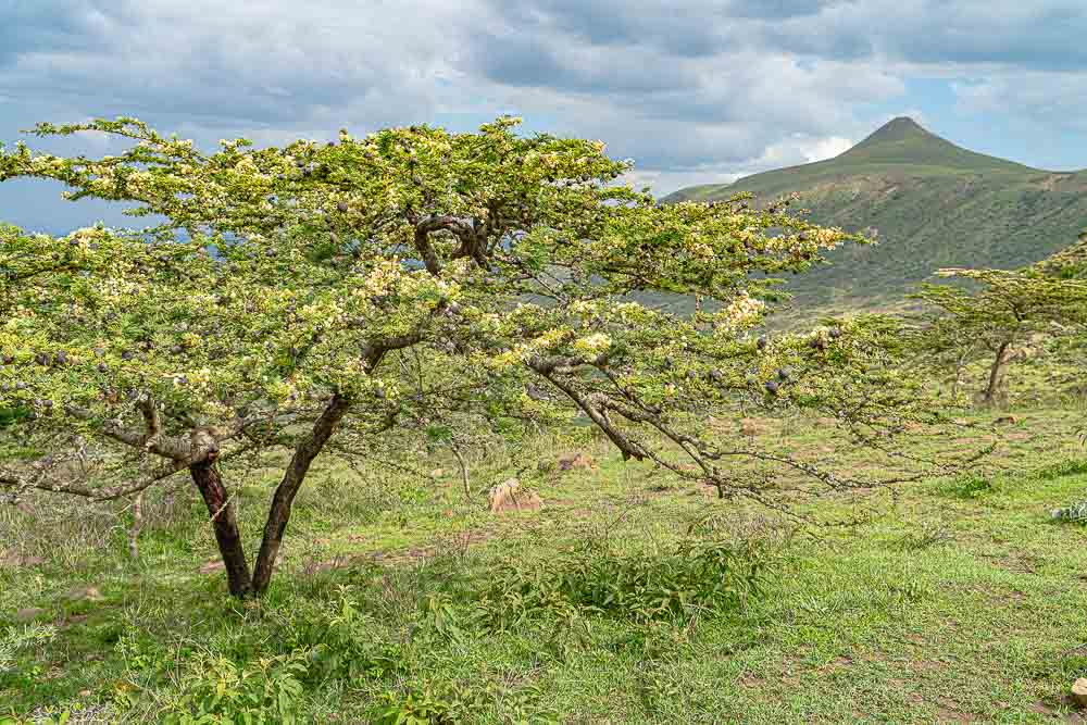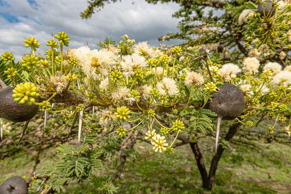 Blühende Akazie. Die Knollen werden von Ameisen besiedelt. Wenn eine Giraffe Blätter fressen will, kriechen sie heraus und beißen die Giraffe in die Zunge. Die Giraffe sucht dann schnell das Weite. Das schützt den Baum vor übermäßigem Fraß.