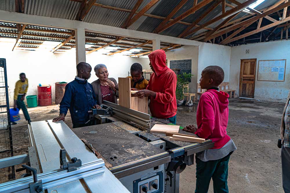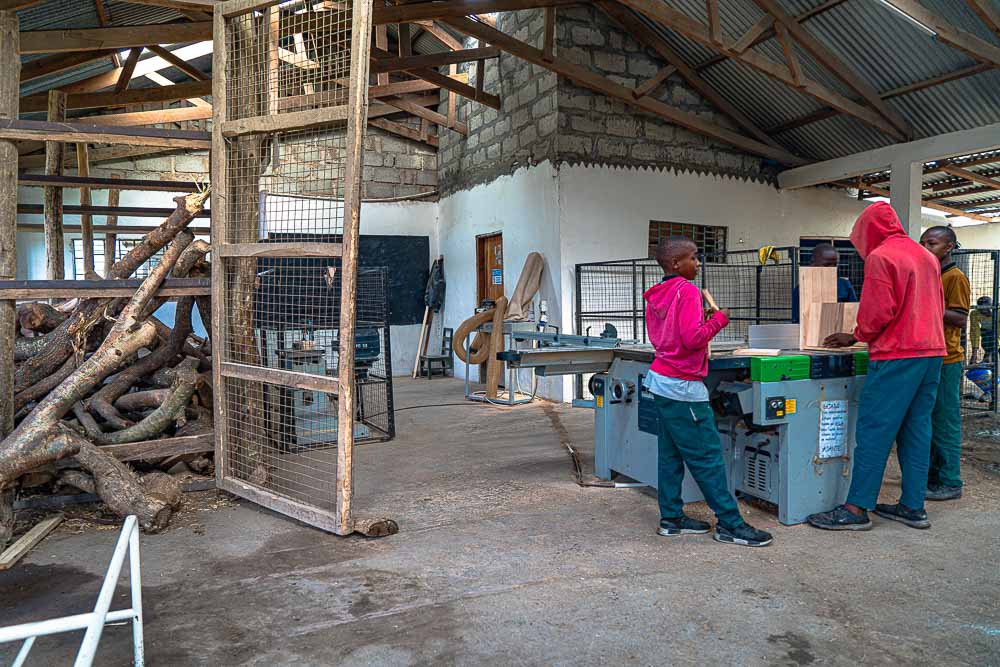 Da der Fahrer einen Reifen aufpumpen muss, fahren wir einen kurzen Umweg nach Ngare Nanjuki zur Werkstätte von Africa Amini Alama, die gleichzeitig Ausbildungsstätte in der Berufsschule ist, wo die Lehrlinge den Automechaniker-, Tischler-, Schlosser- und Maurer- Beruf erlernen können, was wir natürlich gleich zum Besuch dieser Berufsschule benutzen.