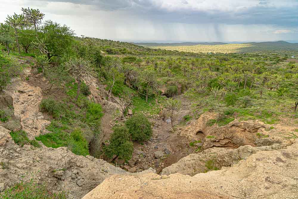 Lockerer Akazien- und Euphorbienwald und Blick ins Tal. Die Mukuru Secondary School ist am Hang gegenüber.