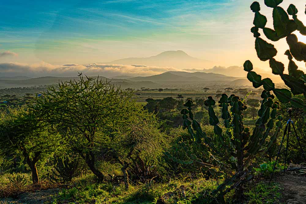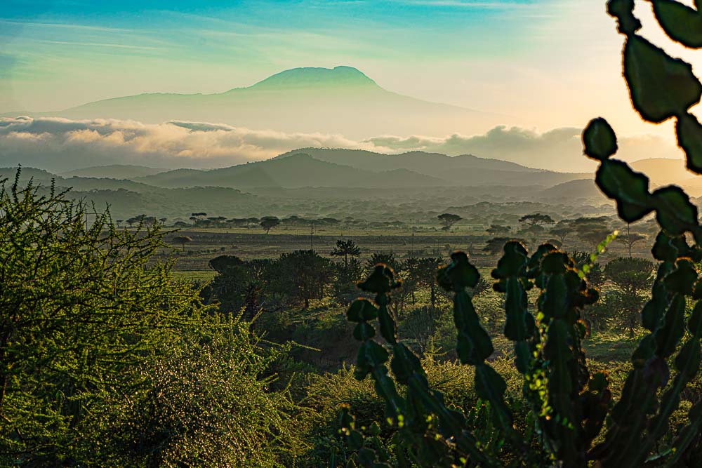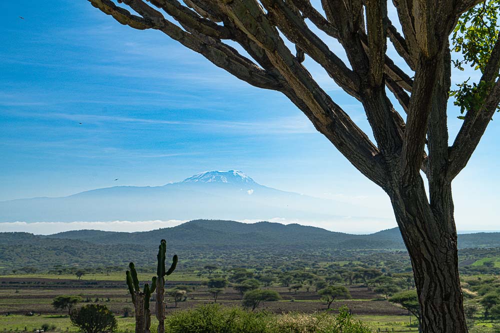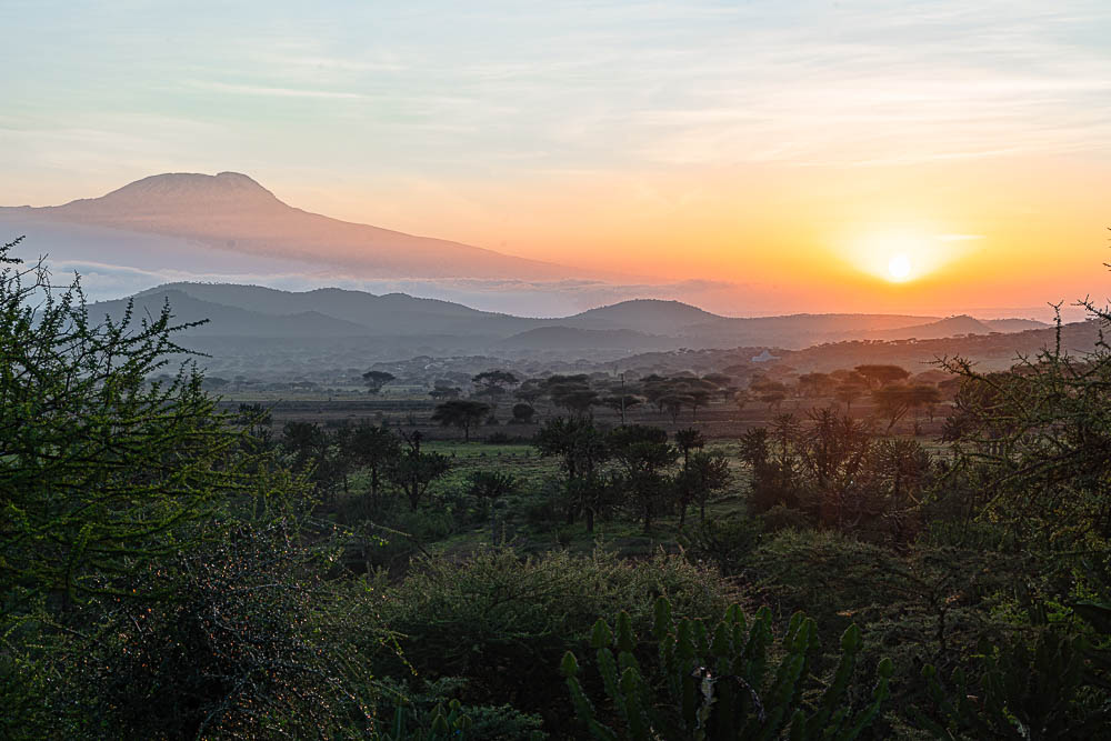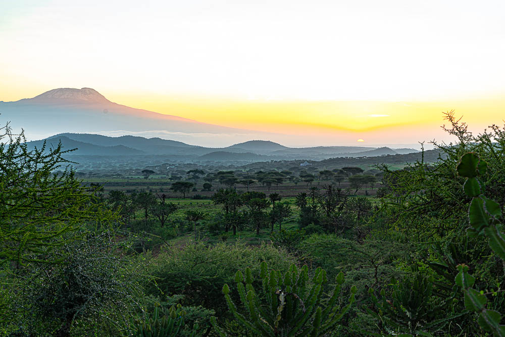 ... mit Ausblick zum Kilimandscharo, jetzt ist der Schnee auf seinem Gipfel von der Sonne beleuchtet.