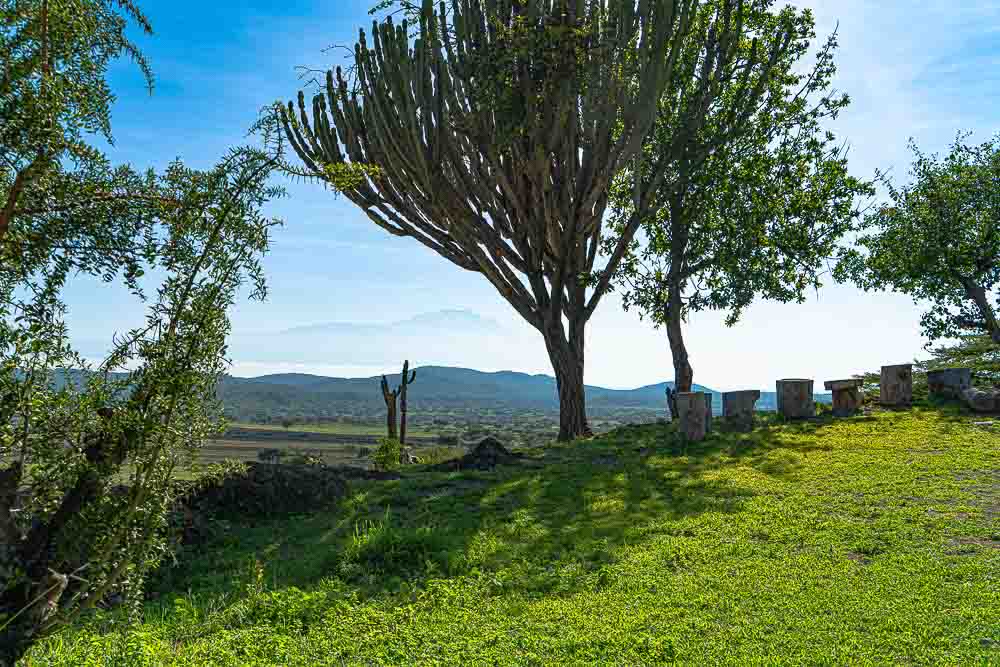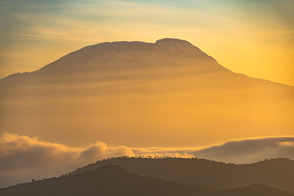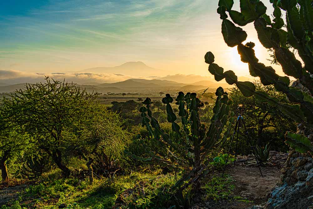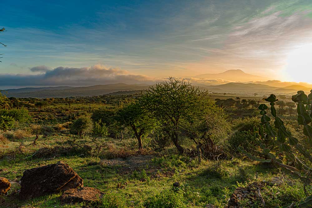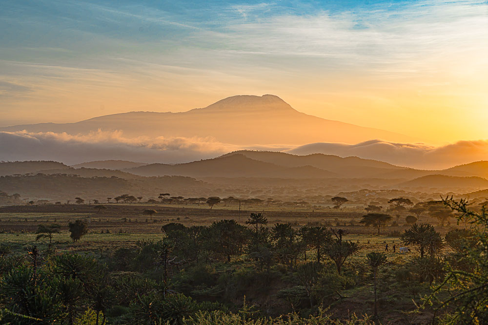 ... mit Ausblick zum Kilimandscharo, jetzt ist der Schnee auf seinem Gipfel von der Sonne beleuchtet.