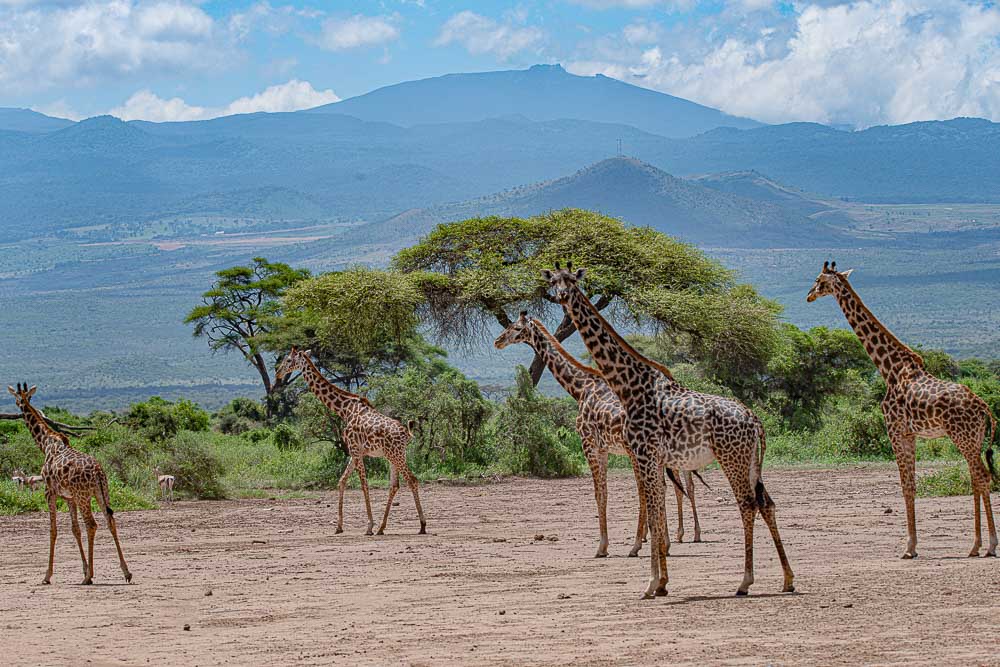 Giraffen und der Blick zu den Ausläufern des Kilimandscharo - Massivs.