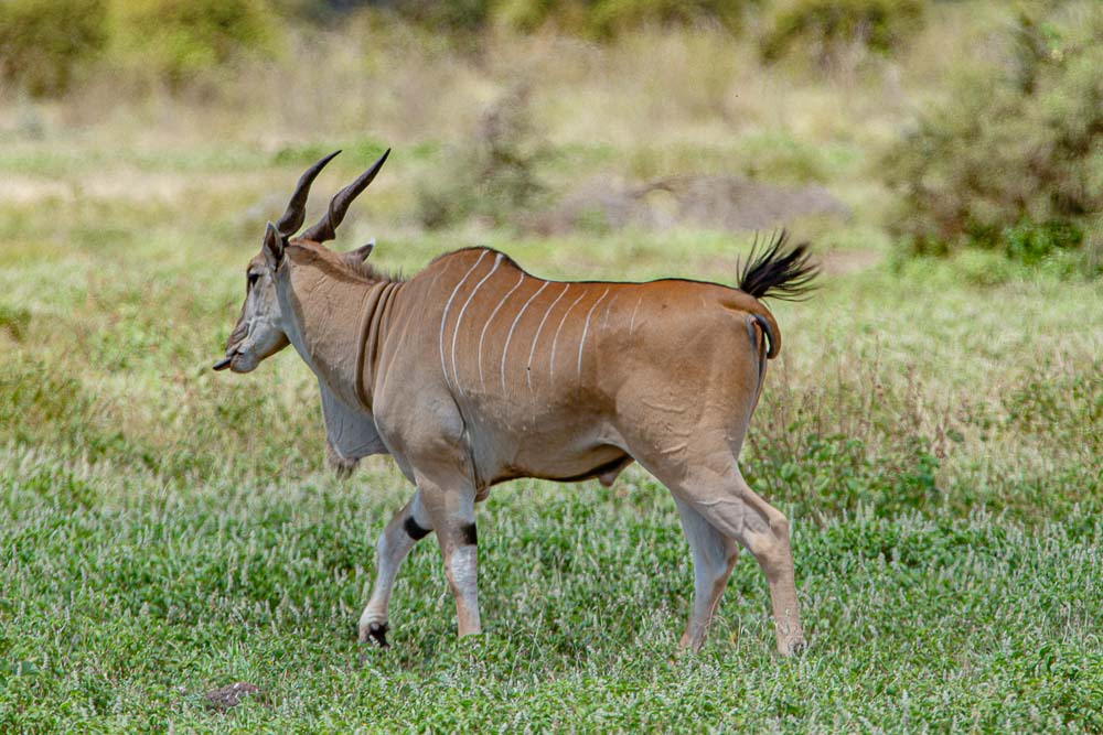 Elenantilopen, eine ungewöhnlich große Herde; links im Hintergrund er zweite, niedrigere Gipfel des Kilimandscharo, der Mawenzi (5.148 m), rechts und vorne der größere und höhere Hauptgipfel Kibo (5.895 m).