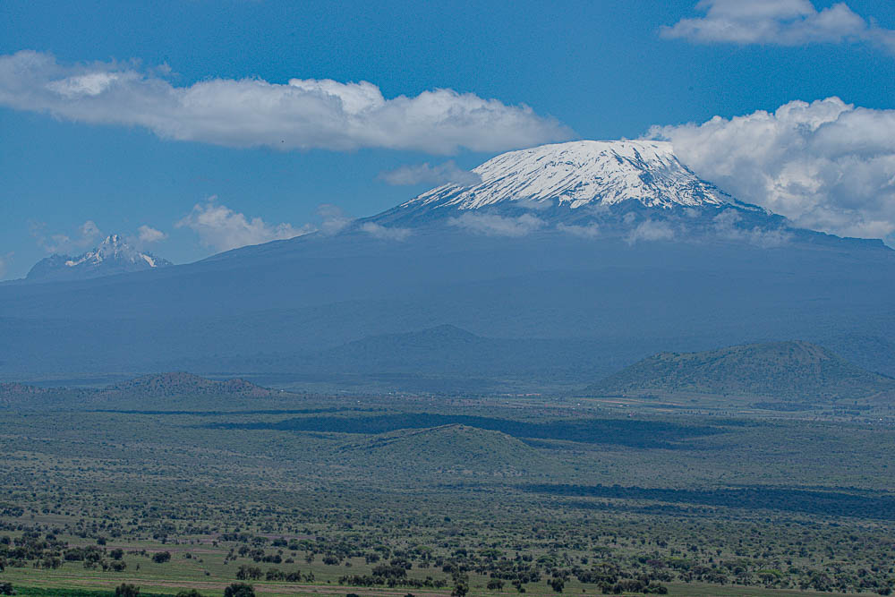 Das Sinya Wildreservat liegt nördlich des Kilimandscharo und entspricht der Fortsetzung des kenianischen Amboseli - Nationalparks auf Tansanischem Gebiet. Da heute ein Ostwind die Thermikwolken vom Kilimandscharo wegbläst, haben wir bis in den Nachmittag hinein freie Sicht zum Gipfel.