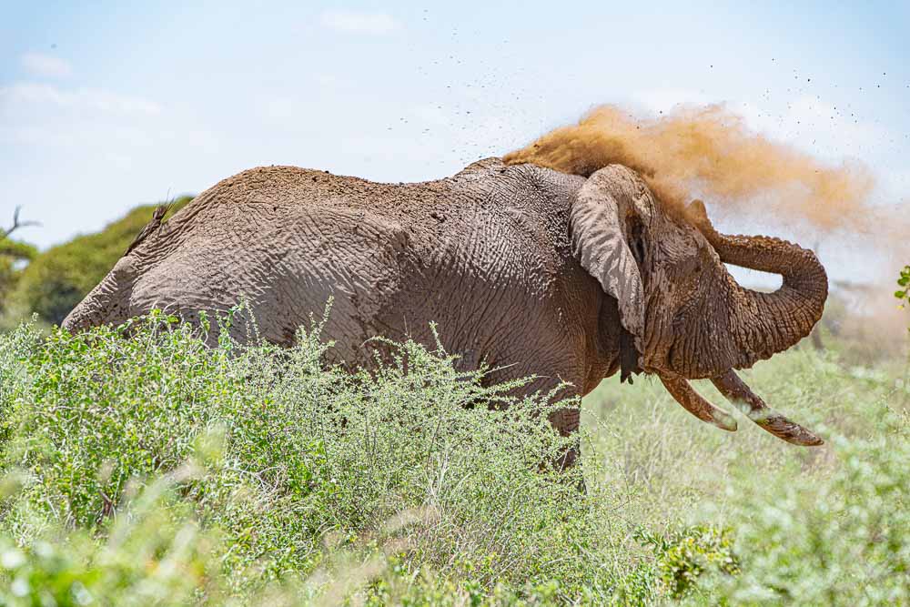 Auch dieser Elefant parfumiert sich, aber diesmal nur mit Staub.