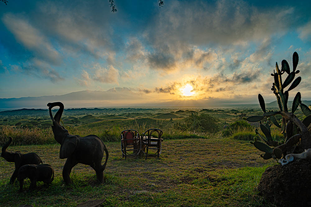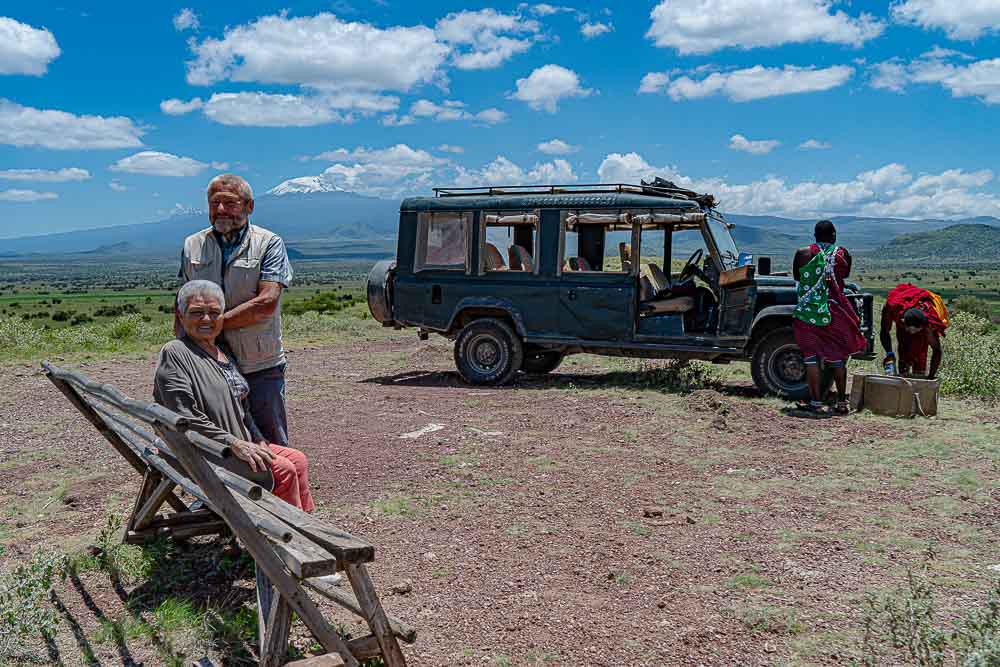 Auf einem Hügel direkt an der Grenze zu Kenia halten wir Mittagsrast mit Blick auf den Kilimandscharo.