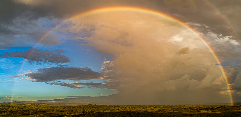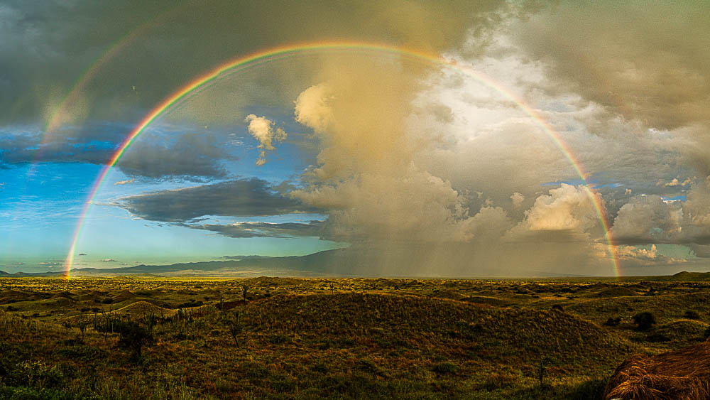 Gegen Ende erscheint oberhalb noch ein zweiter Regenbogen. Zu beachten wäre hier auch noch der aufgehende Mond links von der Wolke, direkt über dem Randgebirge des Kilimandscharo.
