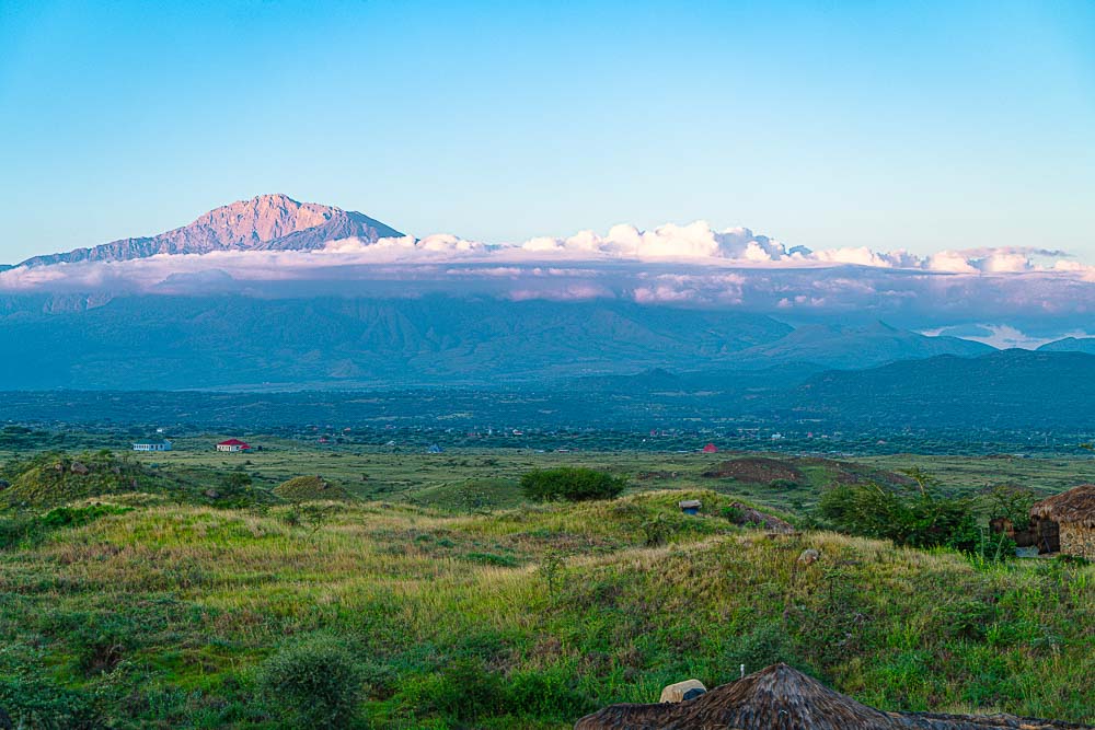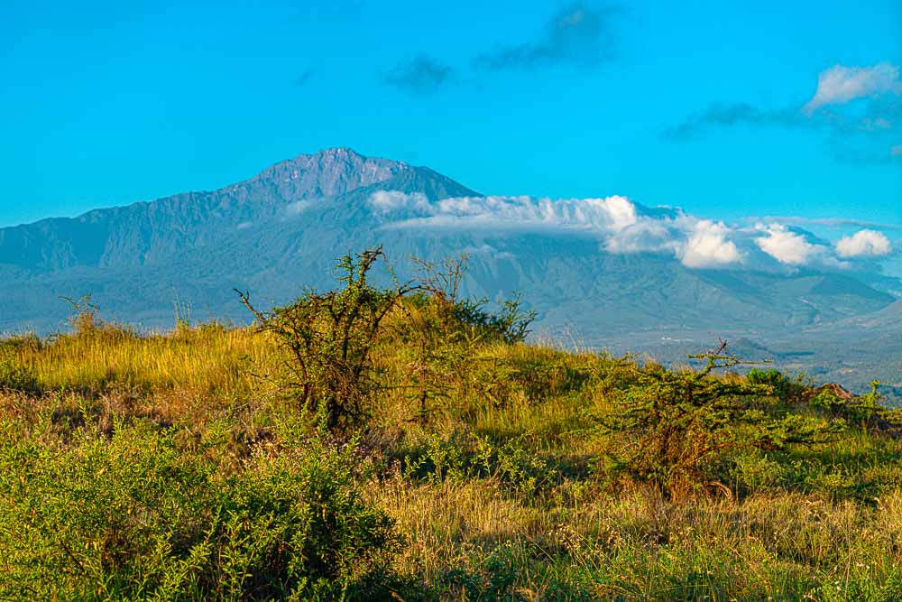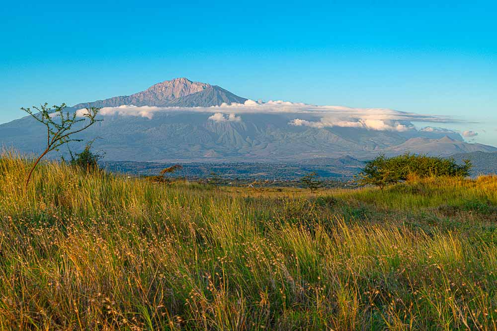 Später am Vormittag ist der Kilimandscharo auch auf seiner Westseite von der Sonne beleuchtet, die Thermikwolken sind aber noch nicht da.