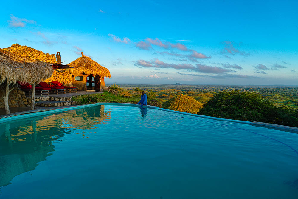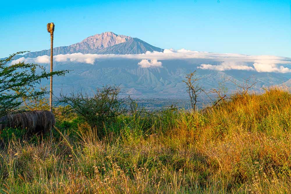 Vom kleinen Hügel hinter dem Pool sieht man zum Kilimandscharo ...