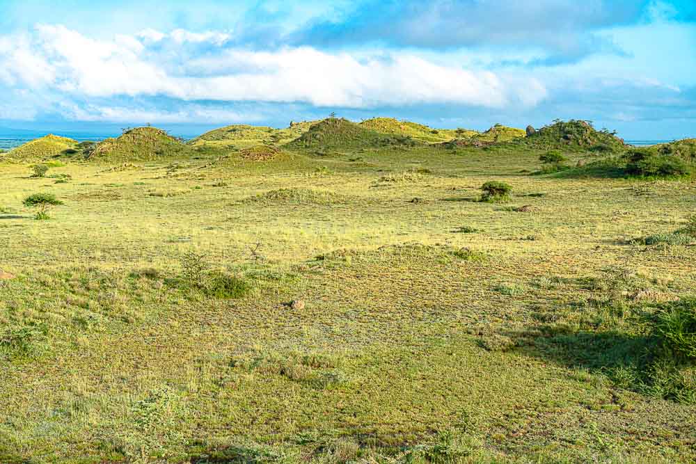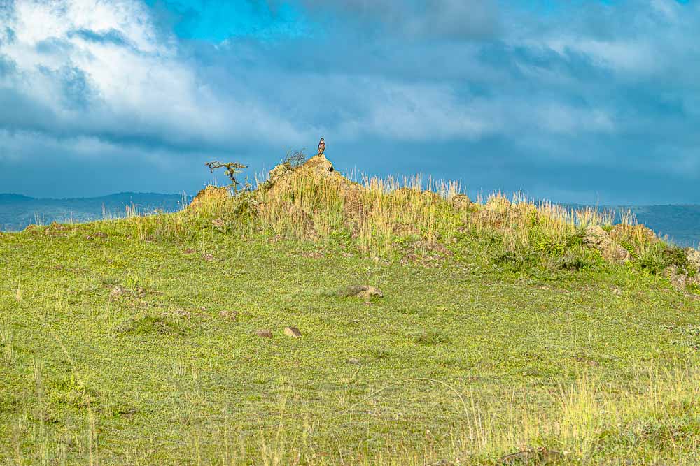 Wir wandern auf einer kleinen ebenen Fläche durch niedriges, von Vieh abgefressenes Gras. Durch den Regen den es momentan gibt wächst es derzeit immer wieder nach.