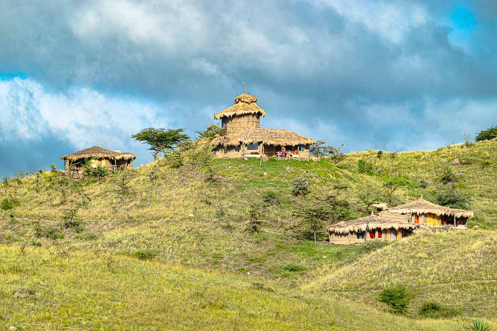 Rechts die beiden Zimmer (im Stil von Maasaihütten), in der vorderen unteren Hütte sind Lorli und Wilfried untergebracht, in der hinteren oberen war ich zu Hause.