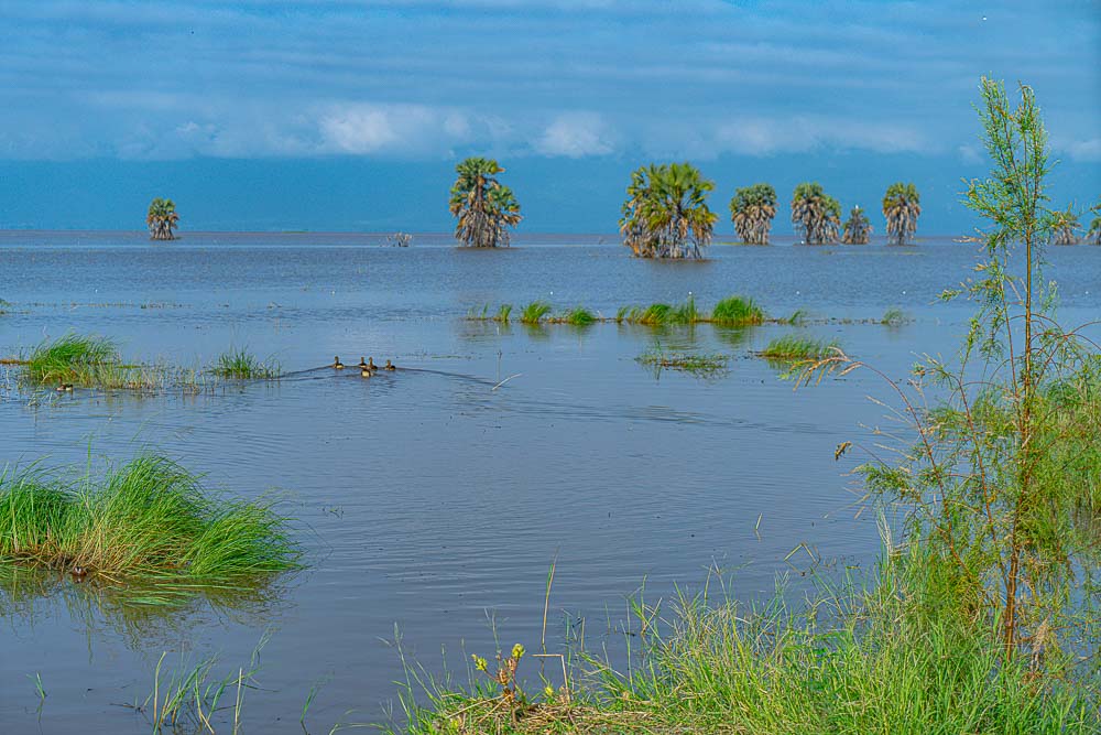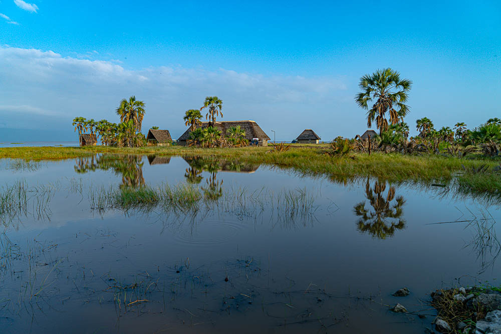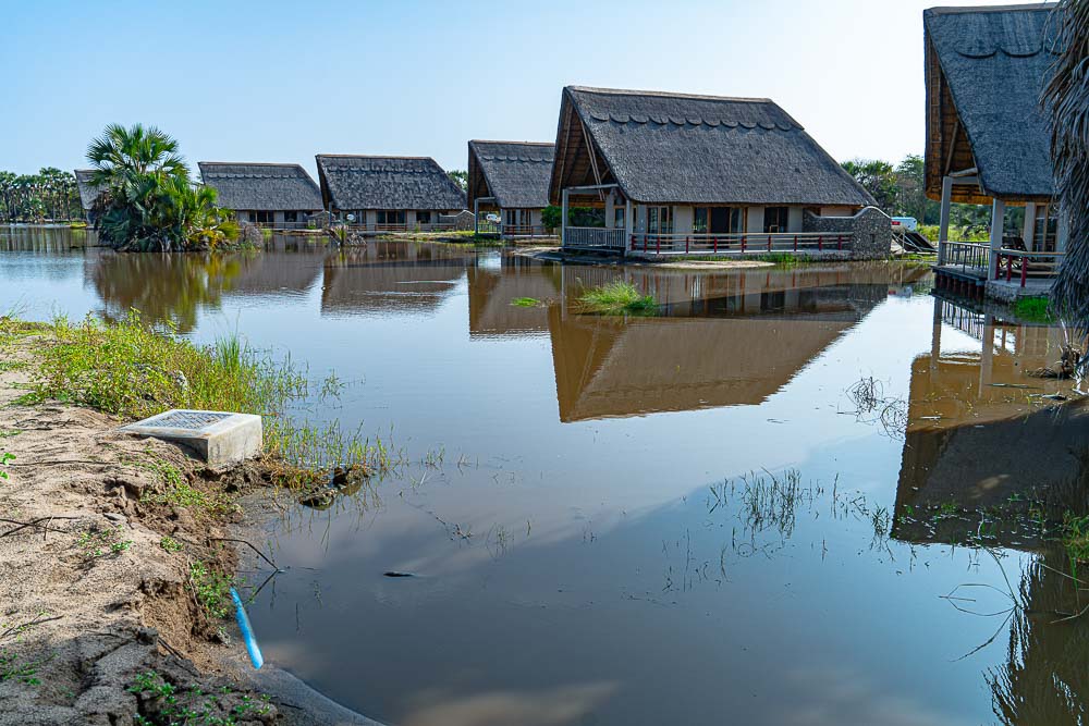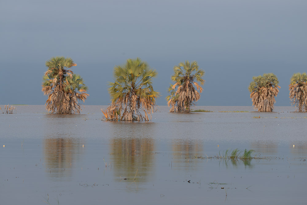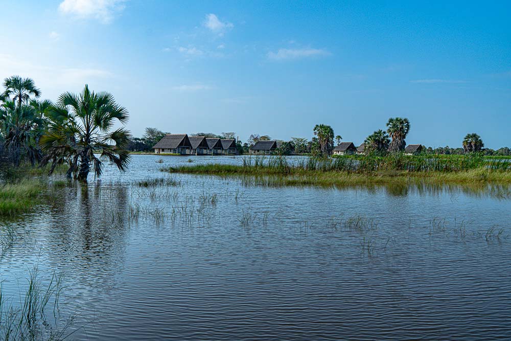 Normalerweise (zur Trockenzeit) stehen die Palmen im Trockenen; seit einigen Jahren aber (Einheimische sagen, das wäre im Zuge des Klimawandels) wird es feuchter, und deswegen reicht der See jetzt unmittelbar bis zu den Häusern der Lodge.