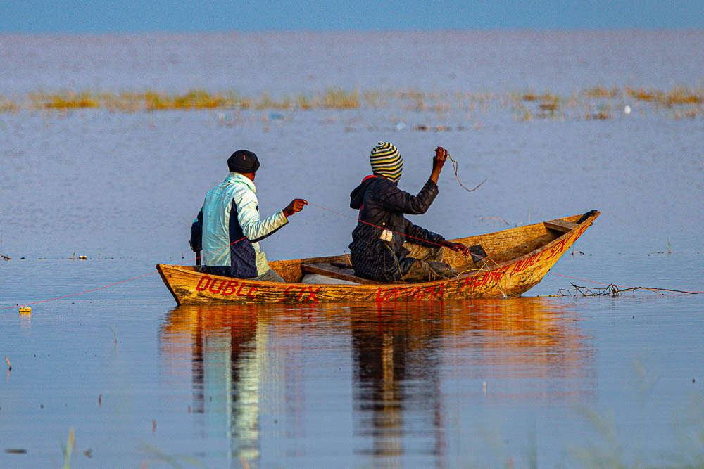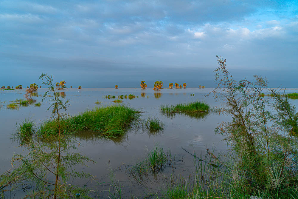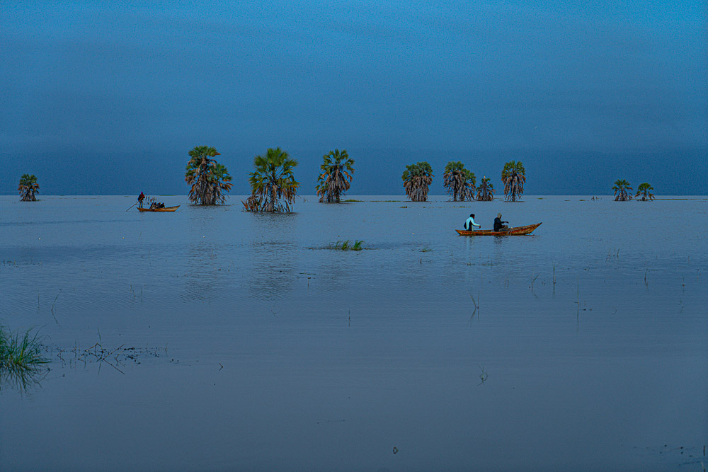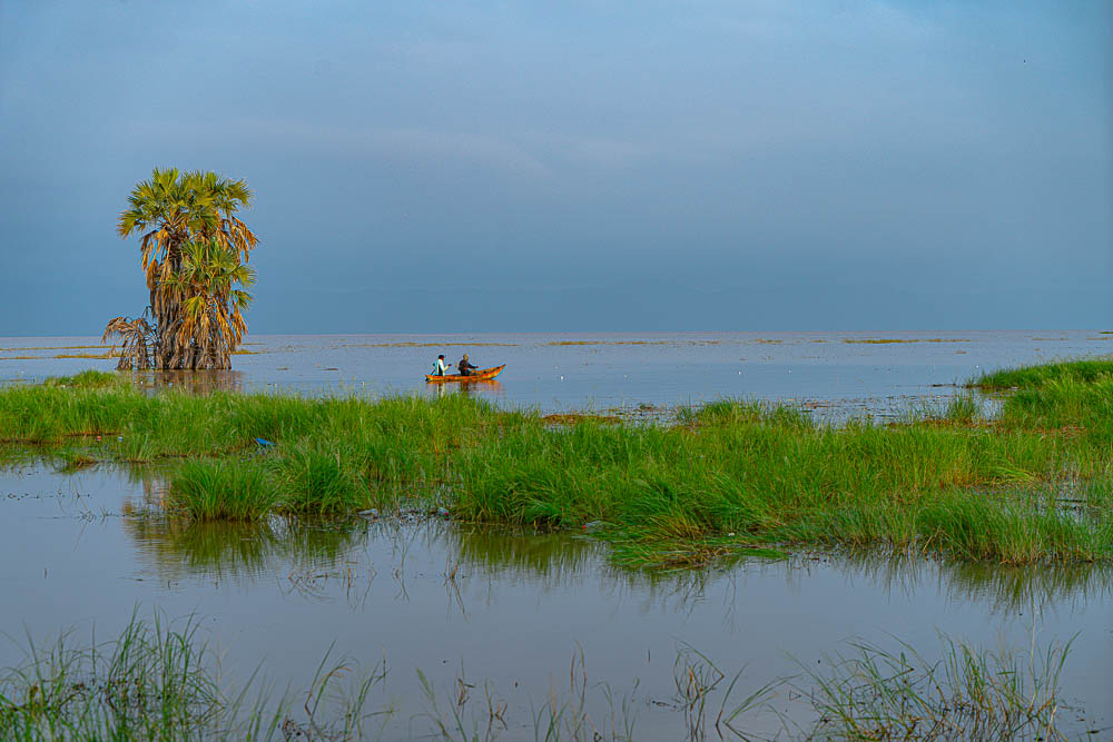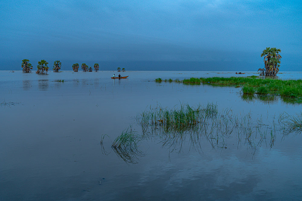Normalerweise (zur Trockenzeit) stehen die Palmen im Trockenen; seit einigen Jahren aber (Einheimische sagen, das wäre im Zuge des Klimawandels) wird es feuchter, und deswegen reicht der See jetzt unmittelbar bis zu den Häusern der Lodge.
