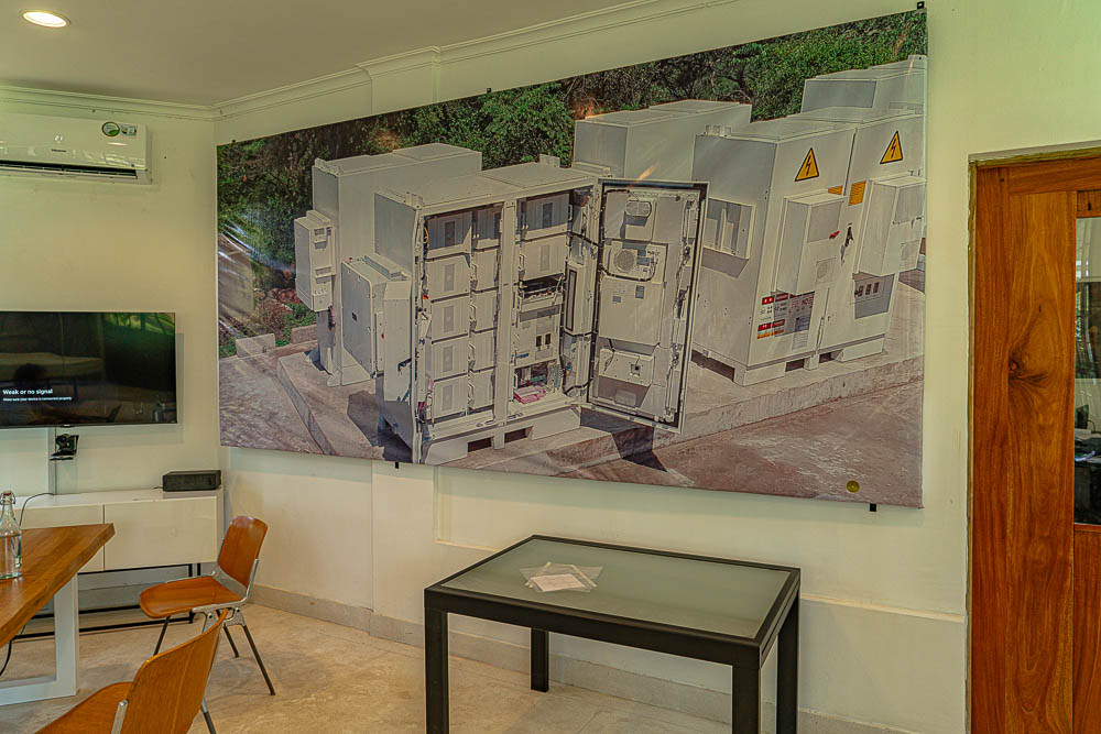 Wandbilder zeigen Projekte der Firma - Solartechnik mit bis zu 1 MW Leistung und mehr, natürlich alles mit Batterien.