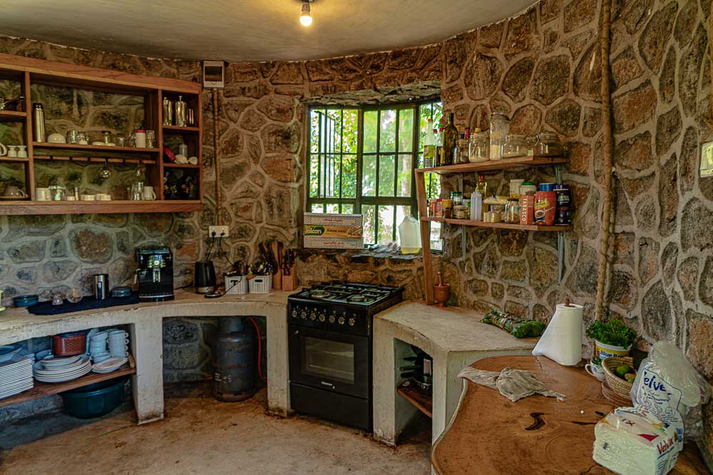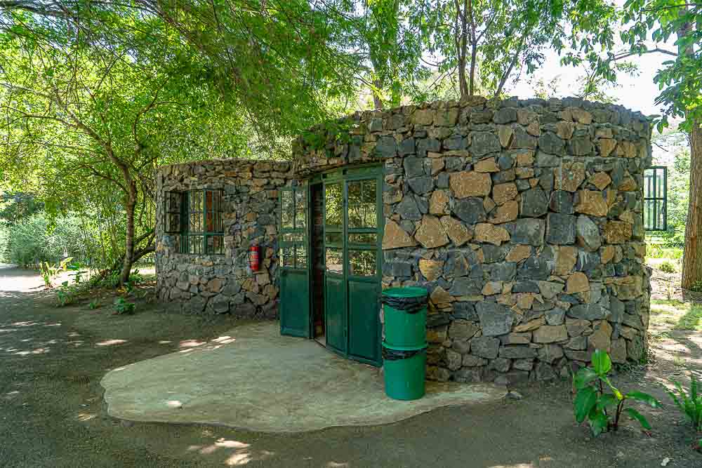 Ein gemauerter Anbau beim Zelt mit Waschtisch, WC und Dusche.