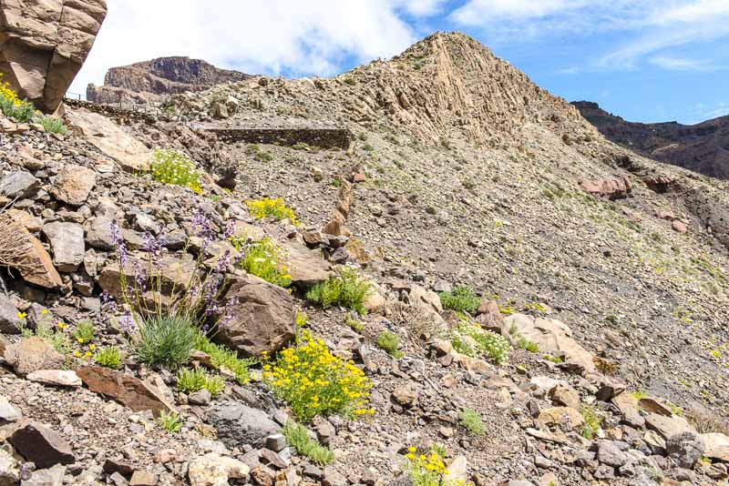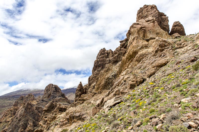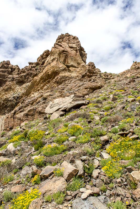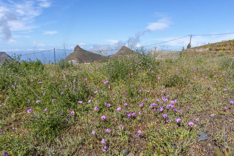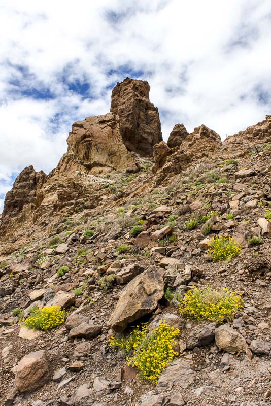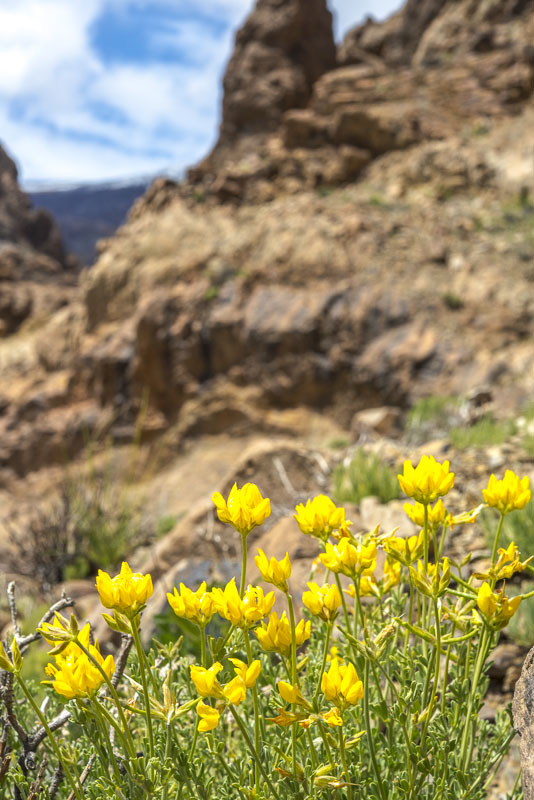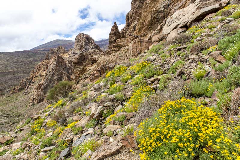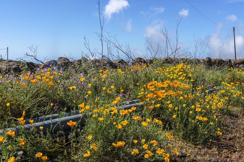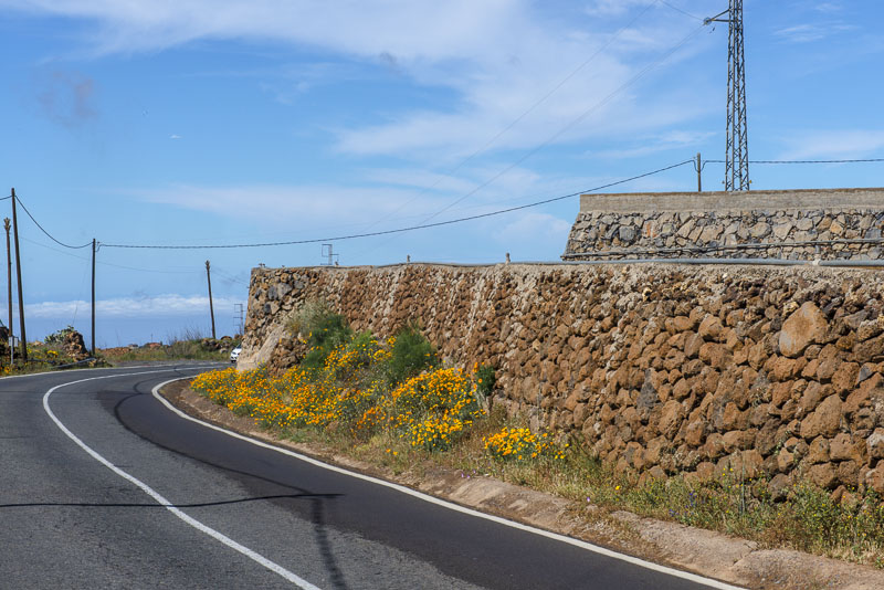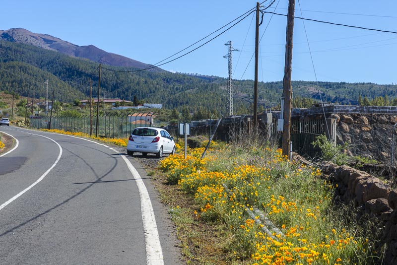 Near Viloflor golden poppies are flowrishing everywhere along the road and inside the village. Now looking up to the mountains of the Teide massive.