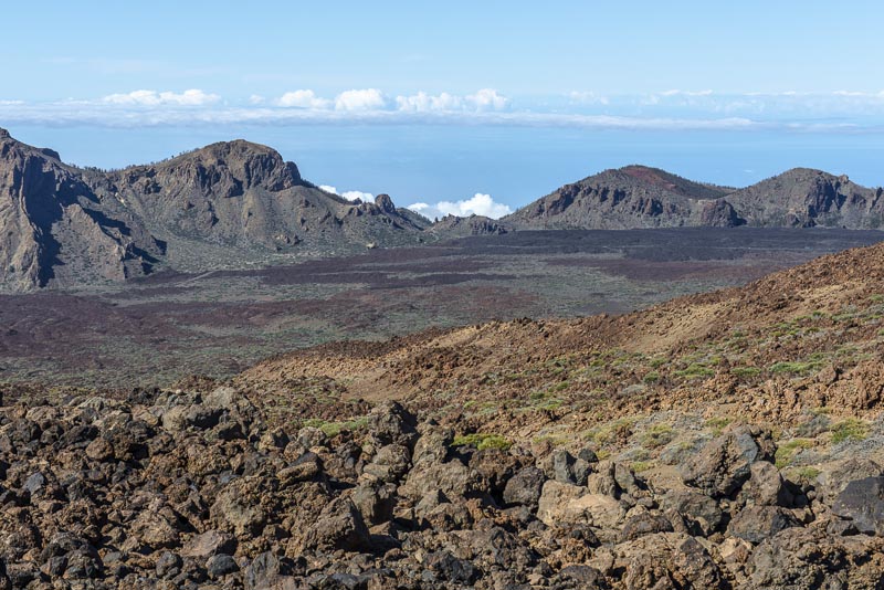 View from Pico Sur over the slopes of Pico del Teide down to the Roques de Garcia and to Guajara. Gran Canaria in the distance to the left.