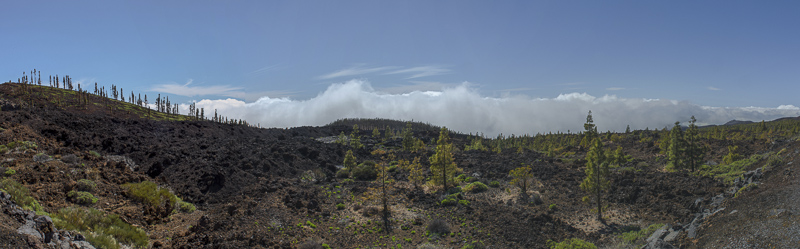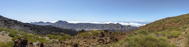 Panoramic picture as seen on the ascent to Pico Viejo. Behind the ridge and the Caldera Las Canadas thermic clouds can be seen, in the far distance to the left is Gran Canaria. Click here or into the picture for a larger version.