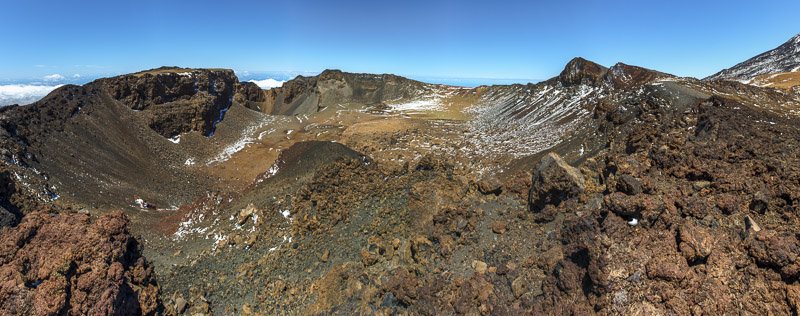You have to stand on the crater rim to recognize that the Pico Viejo only is the highest spot of a huge volcanic crater, much larger than the Vesuvius crater. This is a panoramic picture of this crater as seen from one of the minor peaks, depicted in the map as Pico Sur (3.106 m) (which I regarded as Pico Viejo for the first). Click here or into the picture for a larger version.