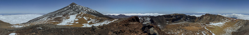 Panoramic picture from the summit of Pico Vieje (3.135 m). Far left the clouds covering Teneriffa´s North, then Pico del Teide (3.707 m), to the right the crater of the Pico Viejo. Click here or into the picture for a larger version.