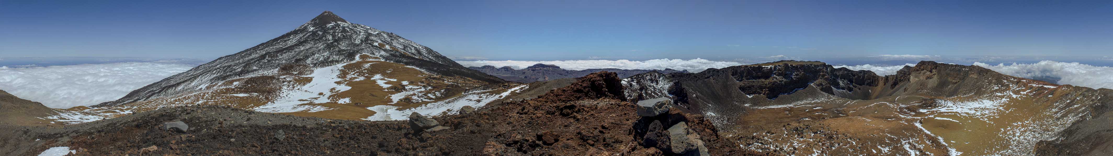 Panoramic picture from the summit of Pico Vieje (3.135 m). Far left the clouds covering Teneriffa´s North, then Pico del Teide (3.707 m), to the right the crater of the Pico Viejo.
