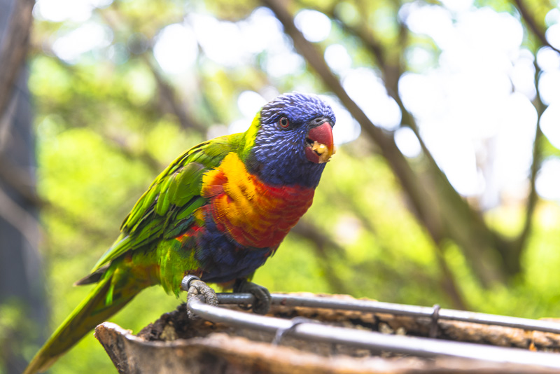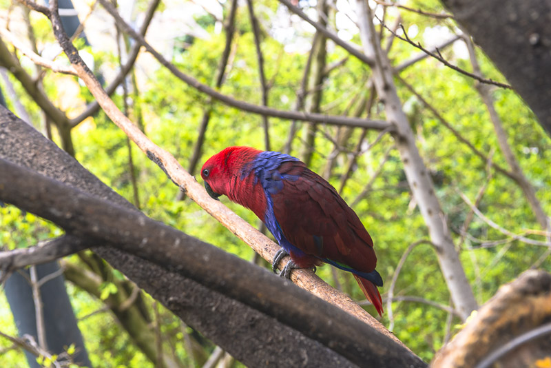 We enter a huge open air enclosure with nets spanned over trees, where you can marvel at birs from rather close - by use of ladders.