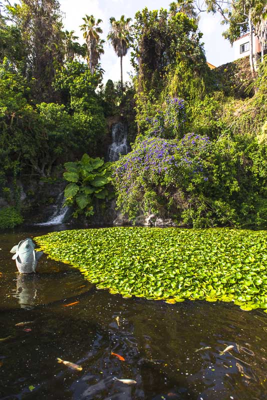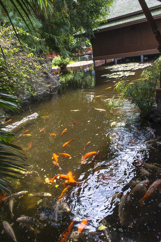 A pond with hundreds of differently colored carps near the entrance