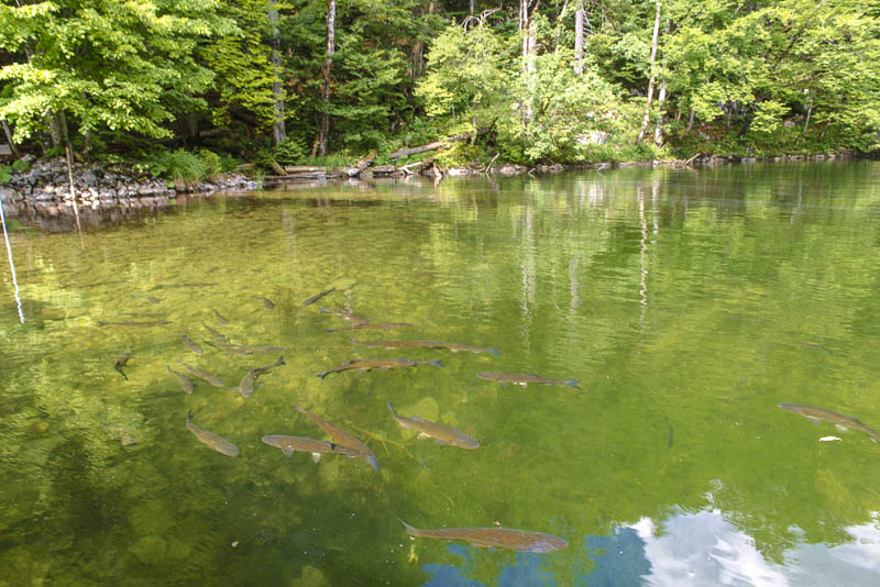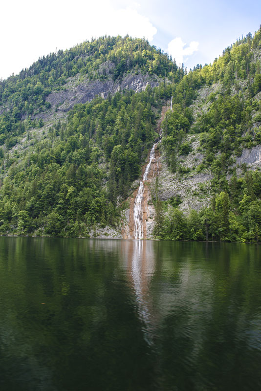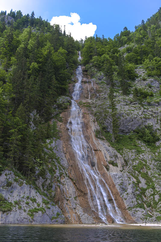 This waterfall comes down directly into the lake. The water does not contain oxygen in the deeper parts of the lake, because there is a saturated salt solution down there; due to the high density of the salt water, the layers are not mixed. Apparently, the ice age glacier that formed this valley has opened a salt dome.