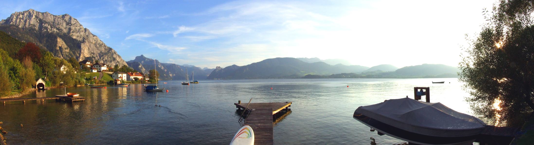 Panoramabild des Traunsees mit Bilck nach Süden, ganz links der Traunstein.