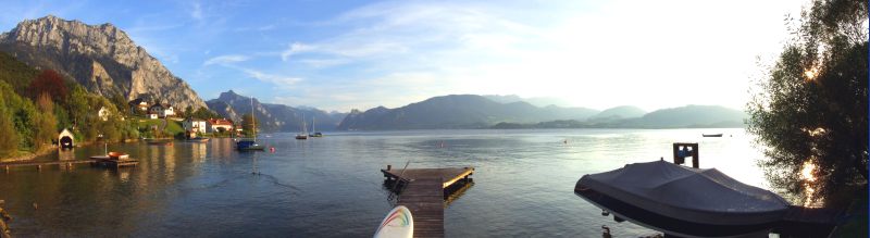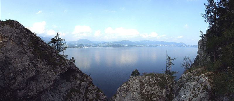 Panoramabild des Traunsees mit Blick nach Süden, ganz links der Traunstein. Hierher oder ins Bild klicken für eine größere Darstellung.