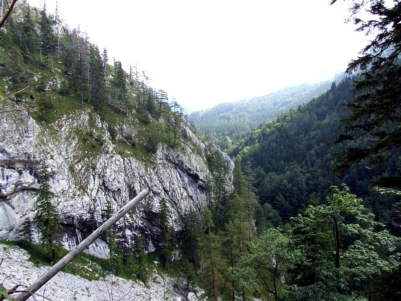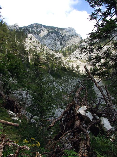Nach einem eher langweiligen Weg entlang der Forststraße durchs Tal des Lainaubaches geht es jetzt auf steilem Weg die felsige Südflanke des Traunsteins hinauf.