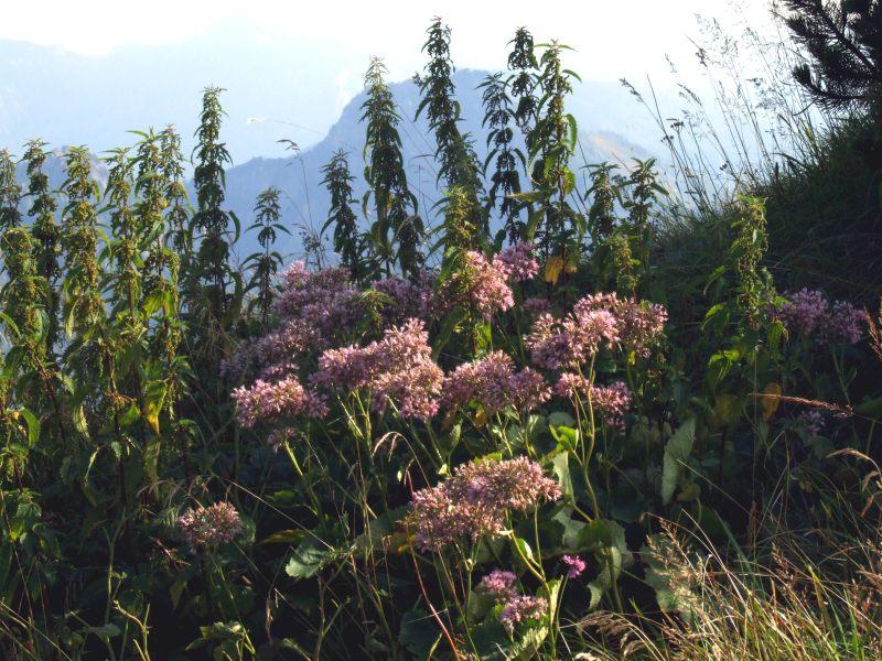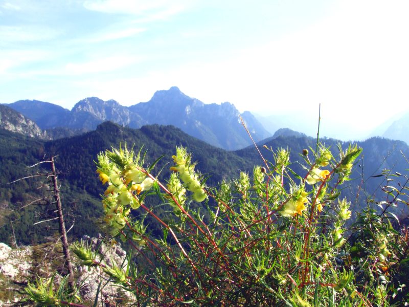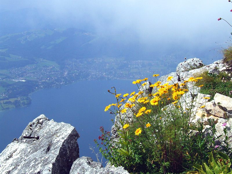 Eberrauten - Greiskraut neben der Hütte, mit Blick auf den Traunsee und Altmünster. Hier ist der Ausstieg der schwierigen Variante des Hernlersteigs.