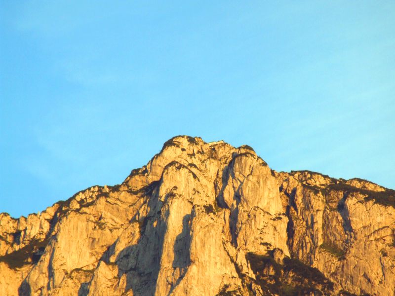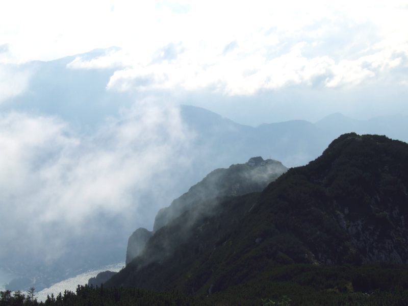 Die Gipfelregion des Traunsteins mit der Gmundnerhütte.