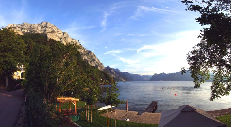 Panoramablick von der Brücke über den Lainaubach zum Traunsee. Hierher oder ins Bild klicken für eine größere Darstellung.