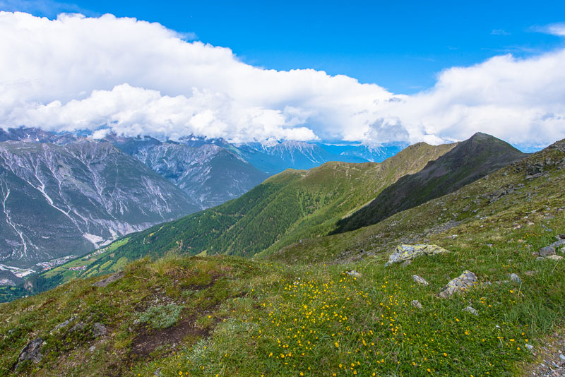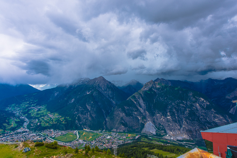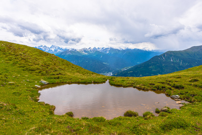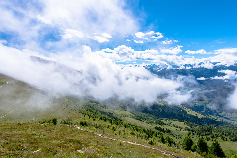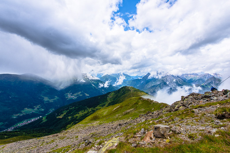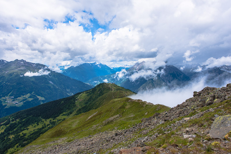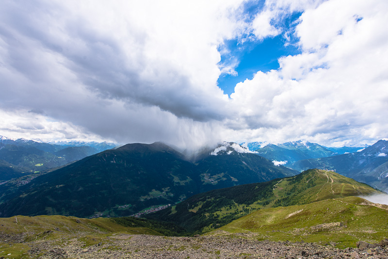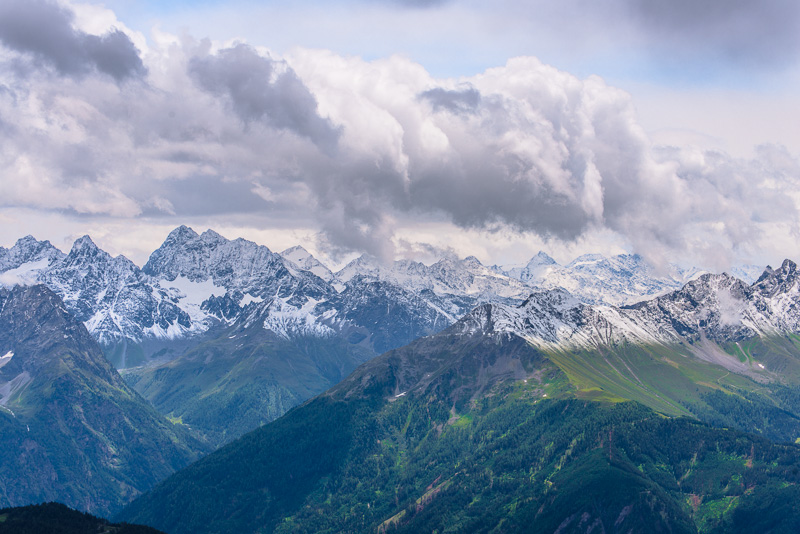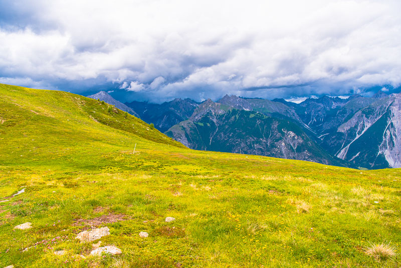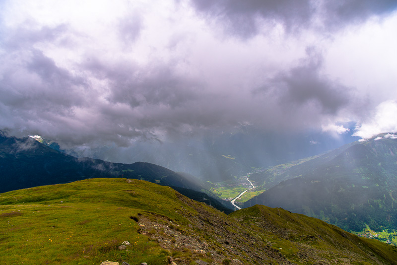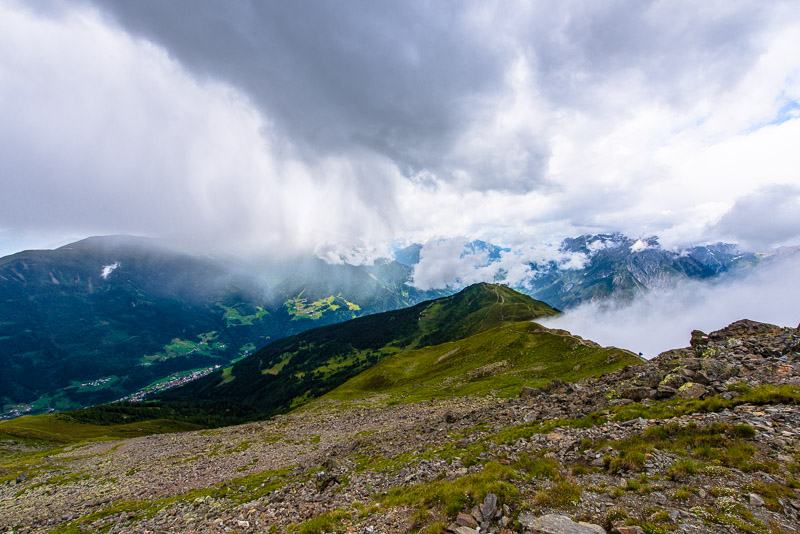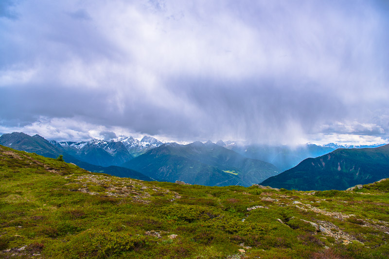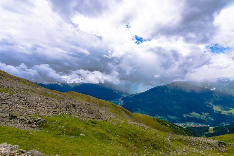 Upper Inn valley. Behind the Samnaun group (right) a shower is building up.