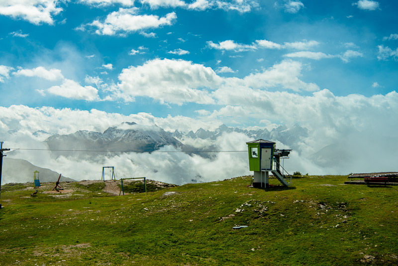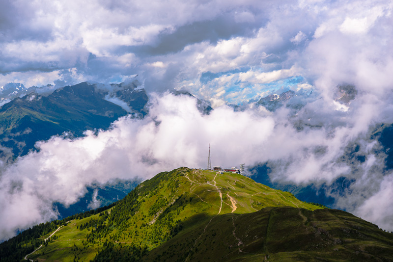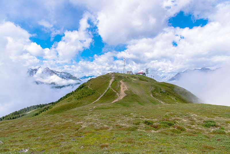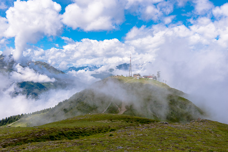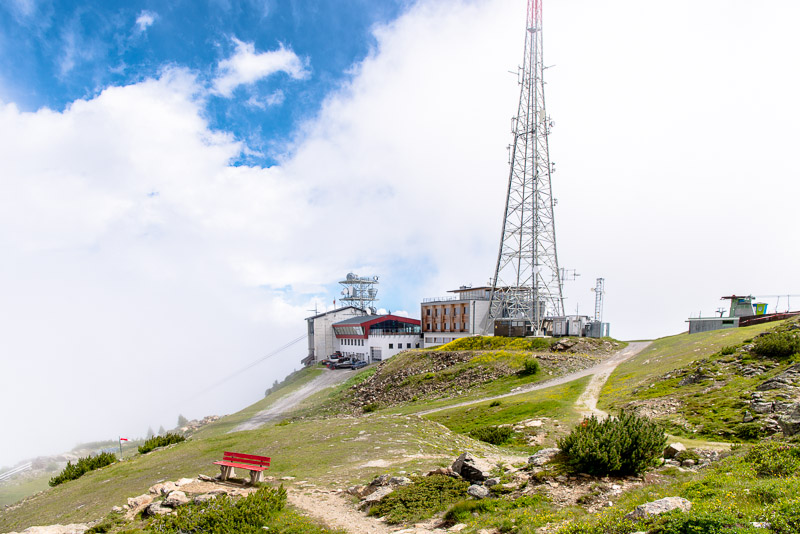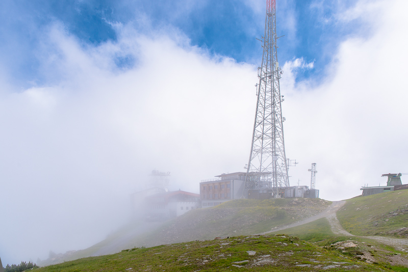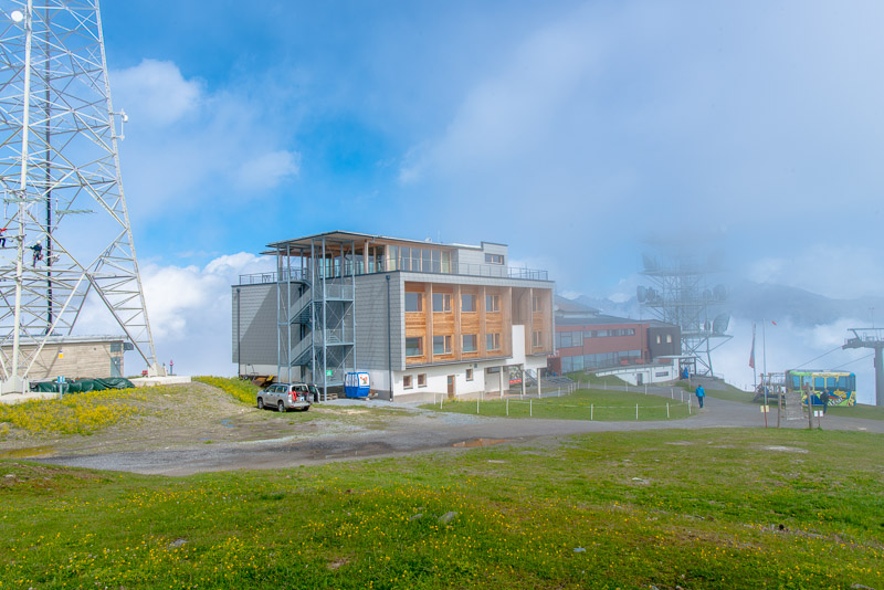 From left to right: funicular summit station, self service restaurant (they call it "panoramic restaurant", but it has the air of a staff canteen), Venet summit hut (with the air of an oversized bivvy tent), radio- and TV transponder.
