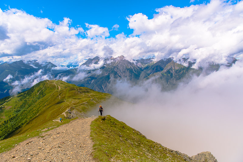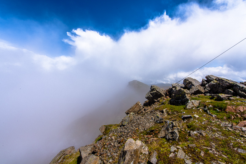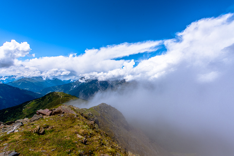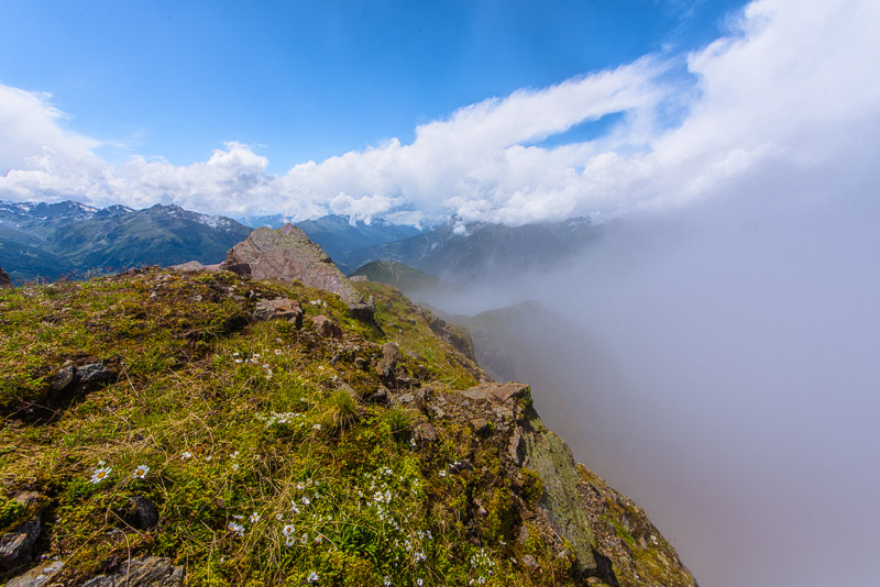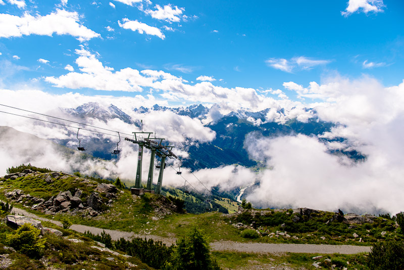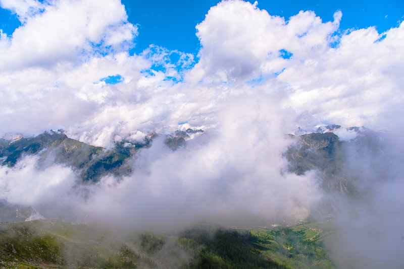 Mist in the upper part of the journey, but sun on the top. View to the Lechtal Alps, over swirling mist.
