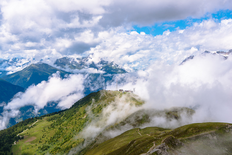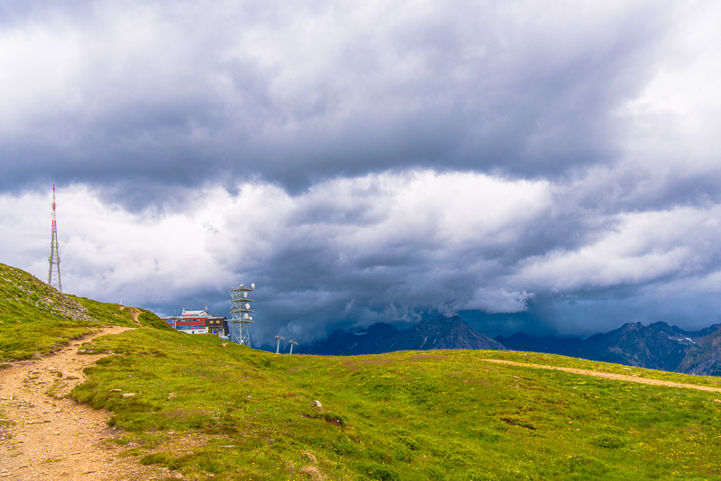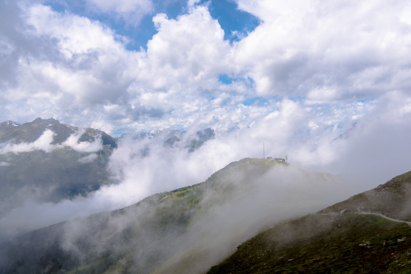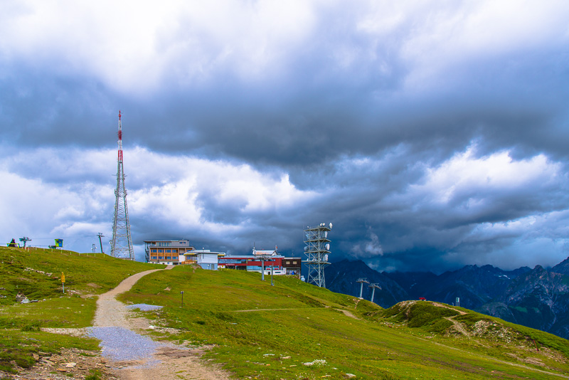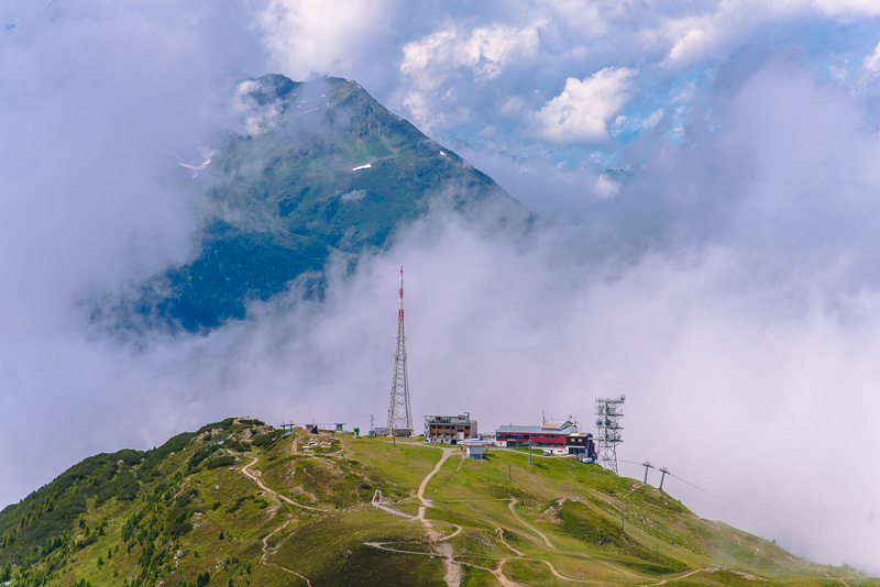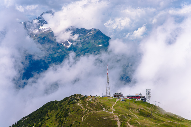 Zooming in to the summit station on the Krahberg, with the Parseierspitze (3.036 m) in behind, the highest mountain of the Lechtal Alps and only summit in the Northern limestone alps higher than 3000 m.