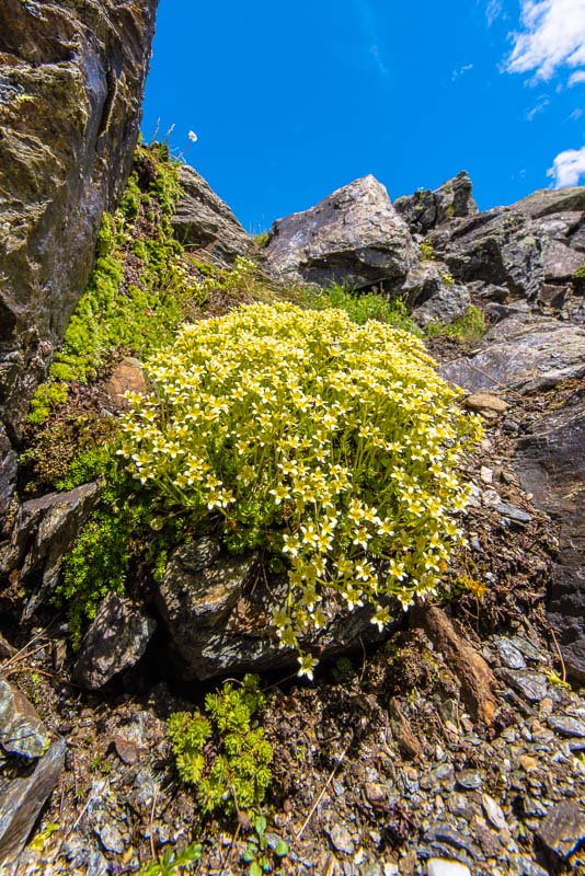 Zwischen den Felsen große Polster Moschus - Steinbrech (Saxifraga moschata)