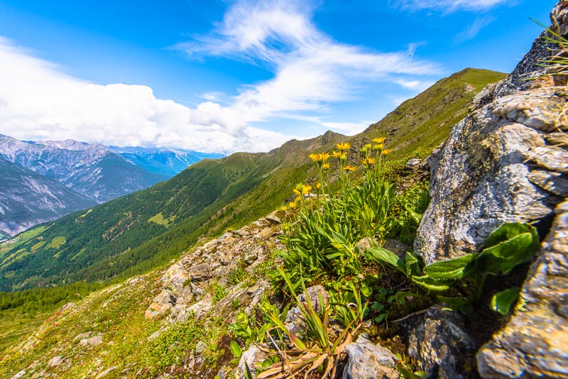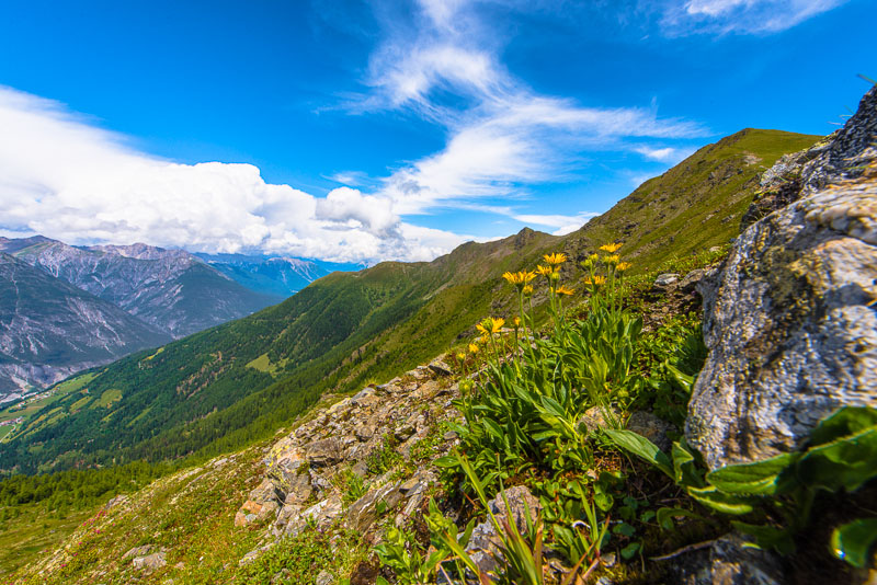 Leopards´ bane (Doronicum clusii) and the view down the Inn valley.
