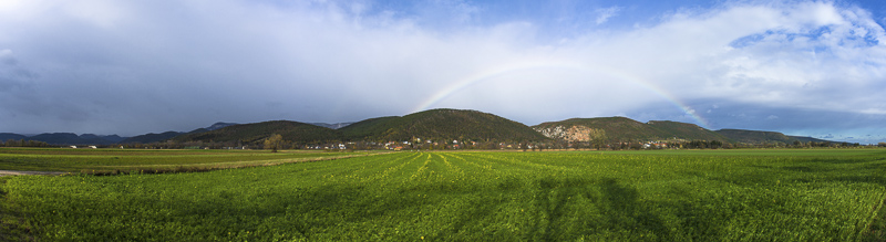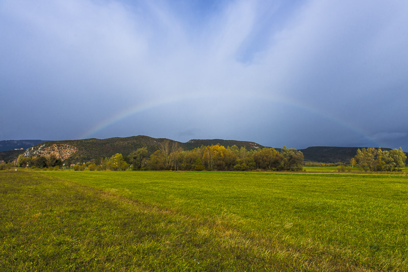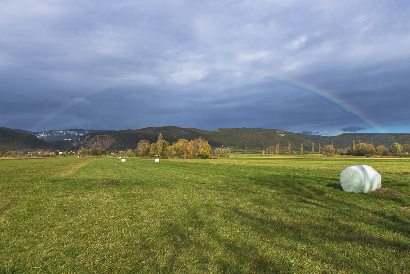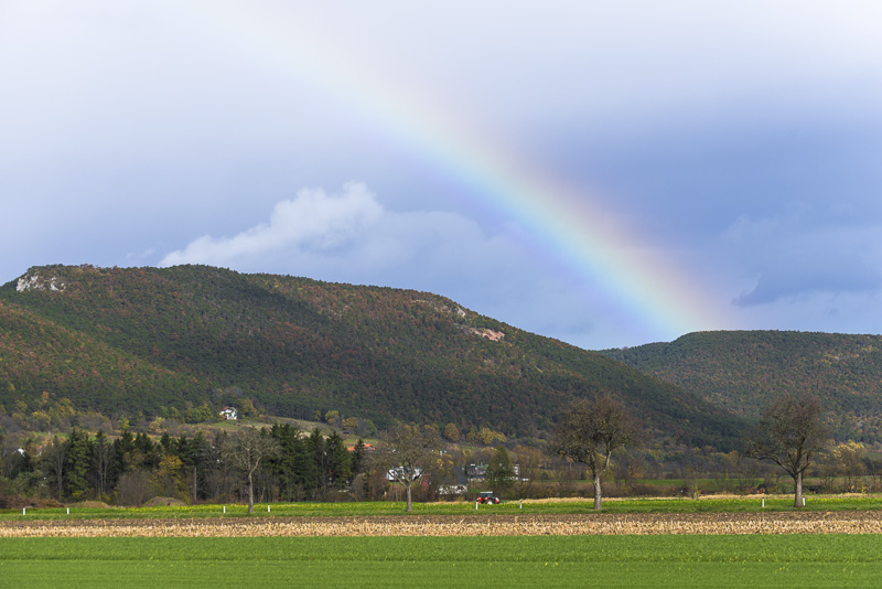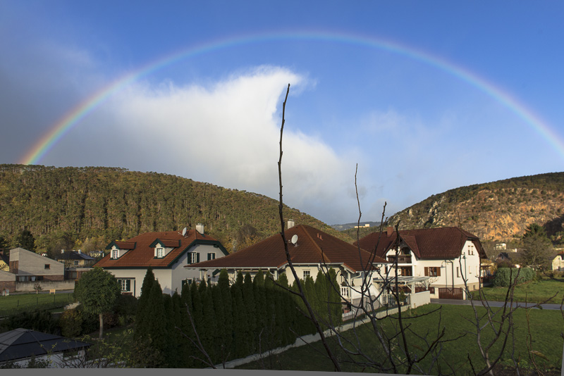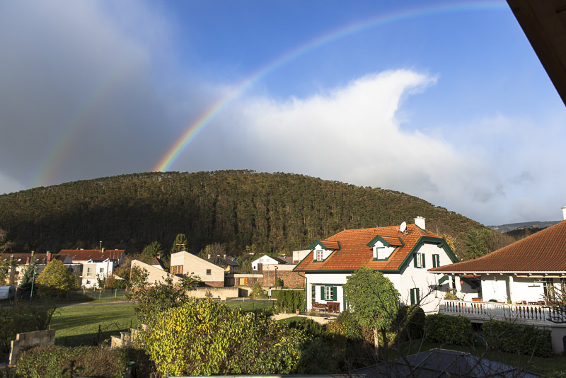 Heute früh schaue ich aus dem Fenster, die Sonne scheint, alles ist nass, und über den Bergen steht ein prächtiger Regenbogen. Sofort eile ich mit der Kamera in den ersten Stock, um das Spektakel festzuhalten: