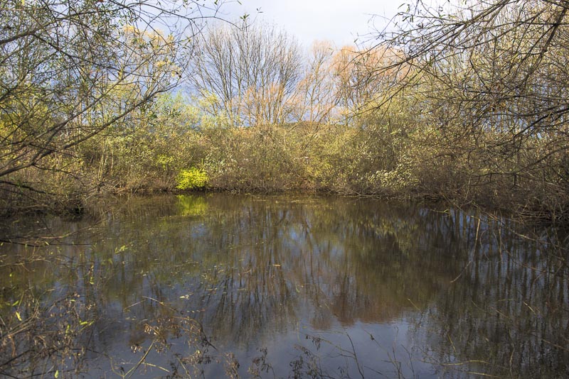 Kleiner, verwachsener, vom Grundwasser gespeister Teich zwischen den Feldern.