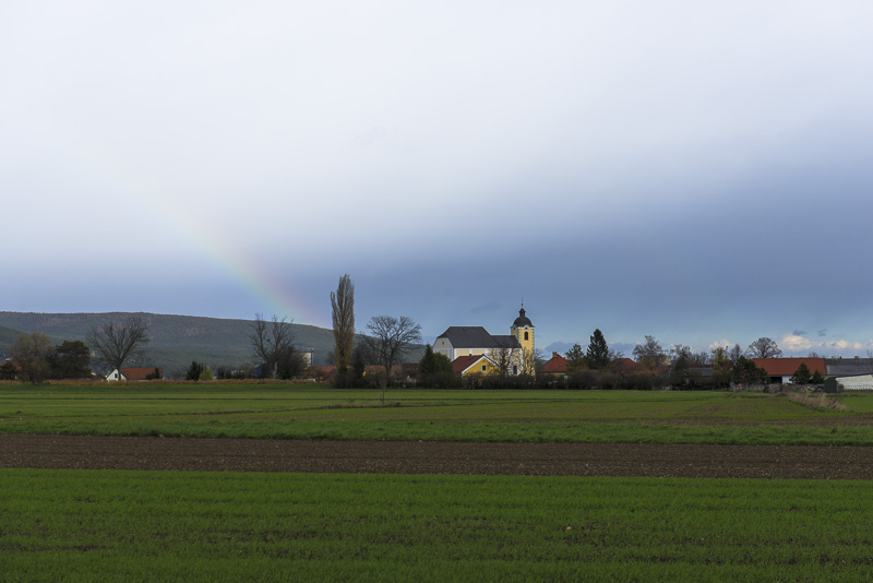 Die Weikersdorfer Kirche. Die Sonne verschwindet jetzt hinter Wolkenschleiern, und bald beginnt es auch herunten in der Ebene zu regnen. Der Zauber ist vorbei, und ich muss heim.