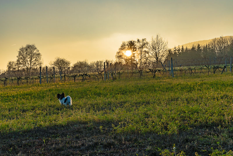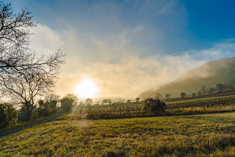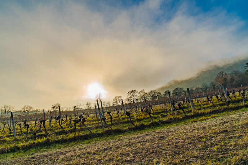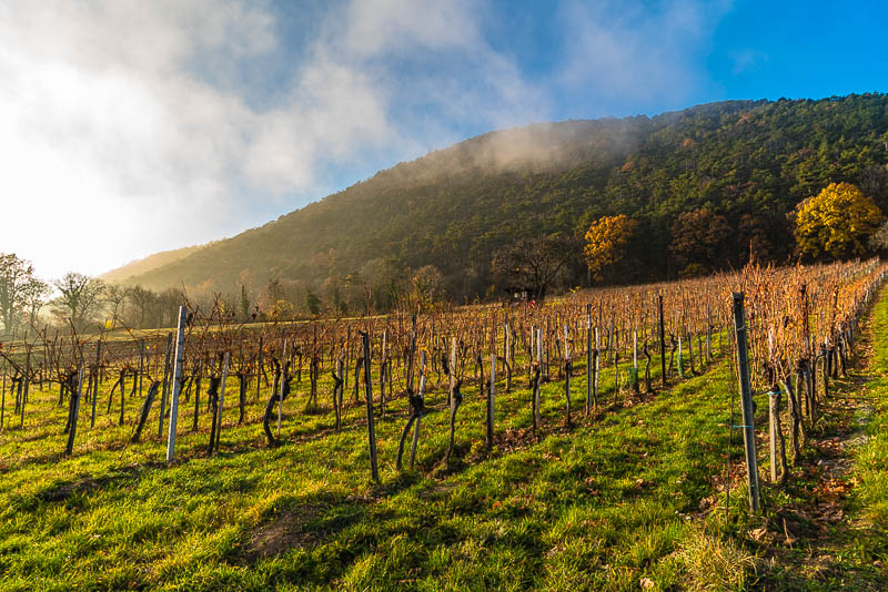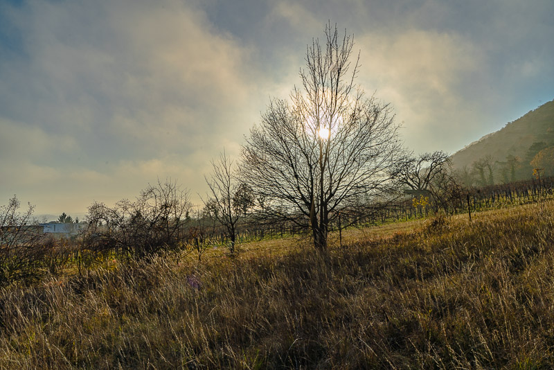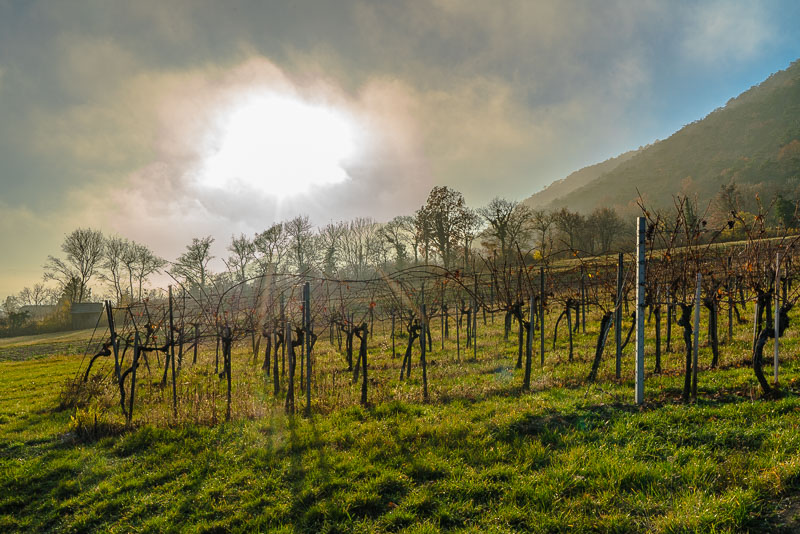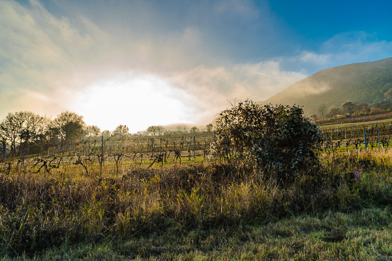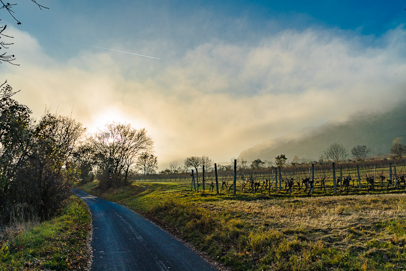 Bis zu Mittag liegt dichter Nebel über Winzendorf. Um 14 Uhr erscheint auf einmal ein wenig Sonne, aber Nebelfetzen hängen noch immer. Das verspricht pittoreske Bilder, und so packe ich kurzerhand die beiden Hunde ins Auto und fahre zu den Weingärten am Winzendorfer Ortsende.