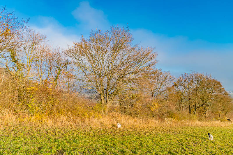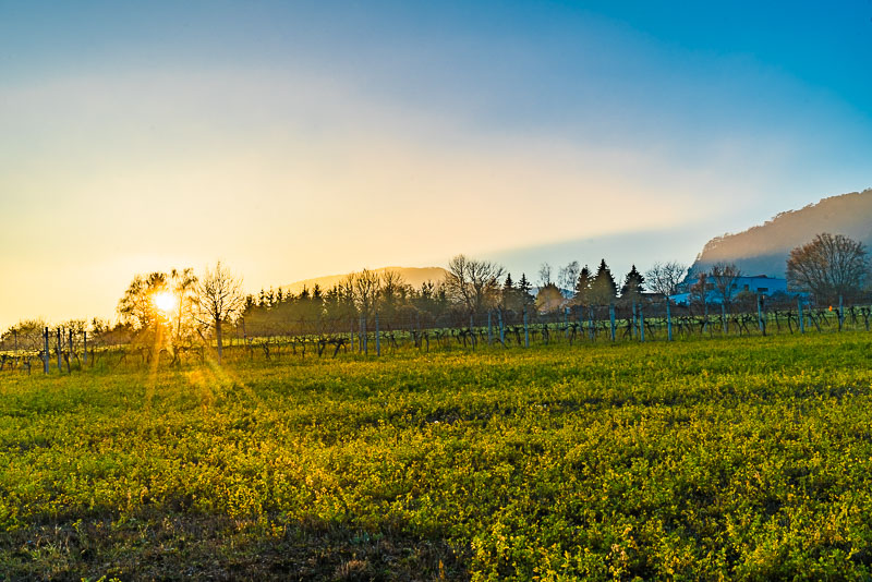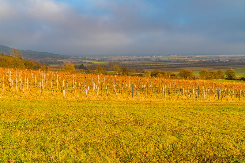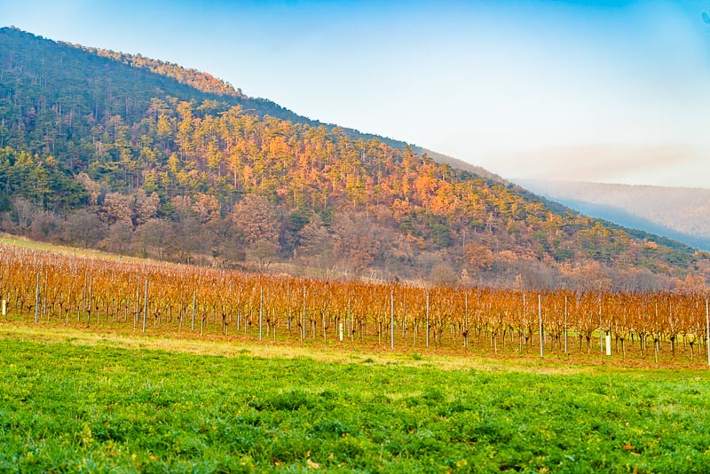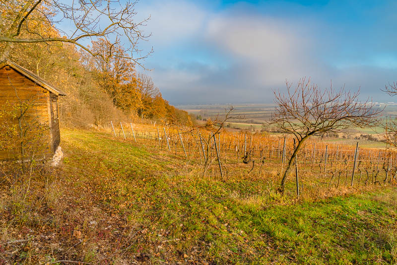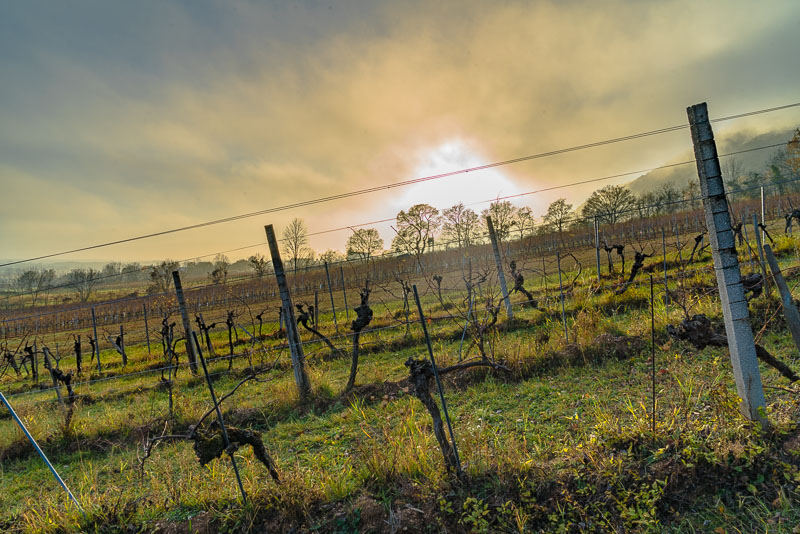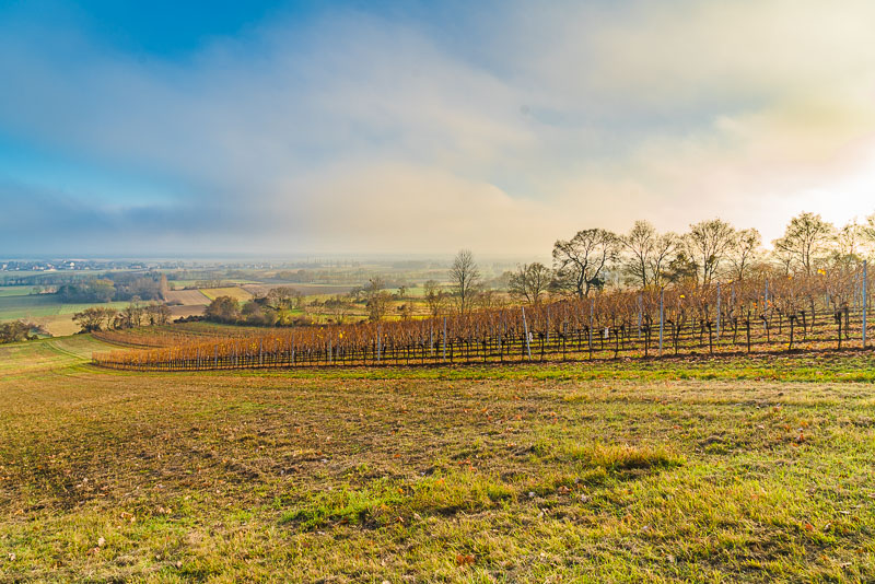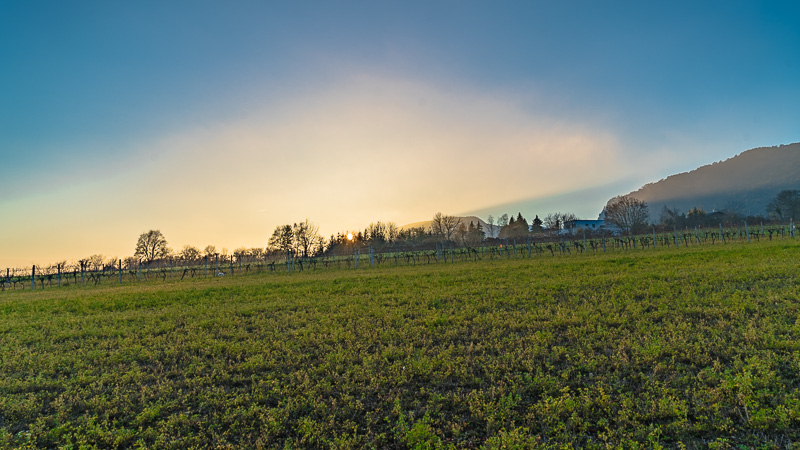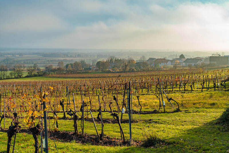Bis zu Mittag liegt dichter Nebel über Winzendorf. Um 14 Uhr erscheint auf einmal ein wenig Sonne, aber Nebelfetzen hängen noch immer. Das verspricht pittoreske Bilder, und so packe ich kurzerhand die beiden Hunde ins Auto und fahre zu den Weingärten am Winzendorfer Ortsende.