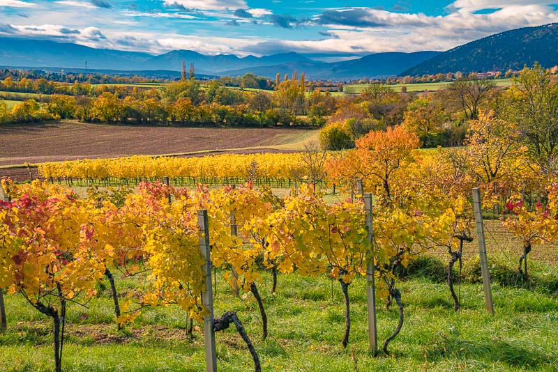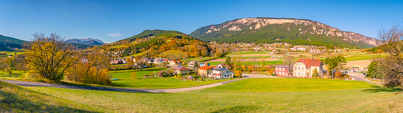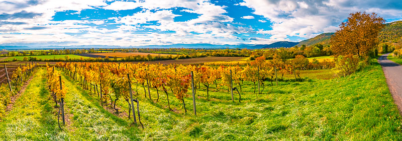 Vineyard panorama near Bad Fischau/Brunn looking to Wechsel and Winzendorf. Click here or into the picture for a larger display.