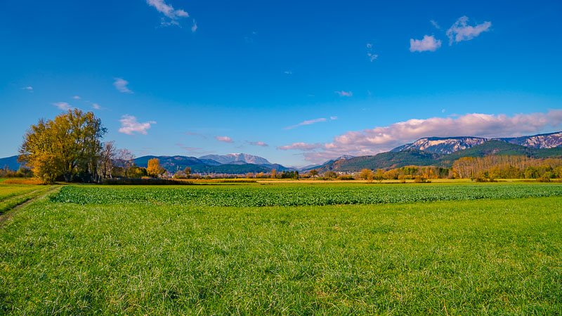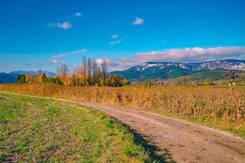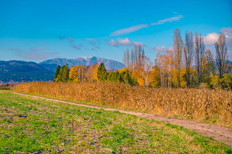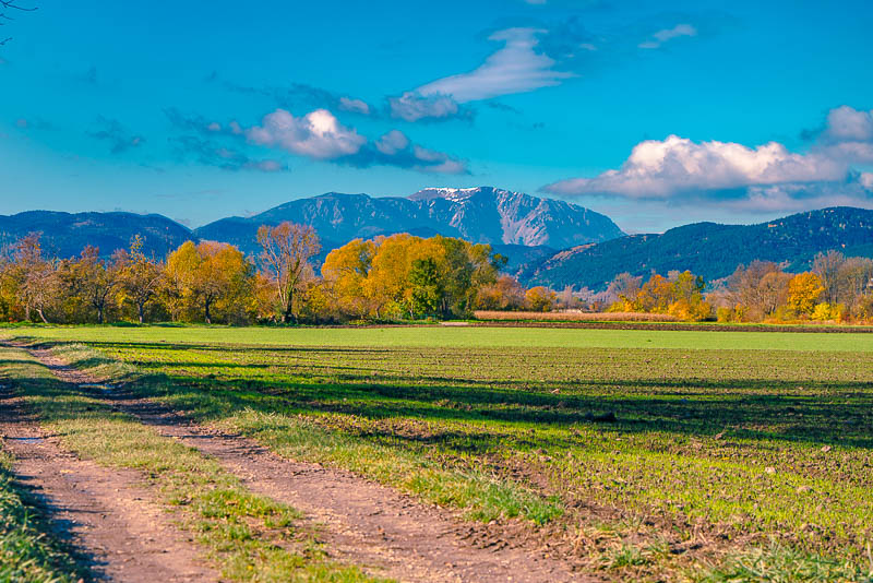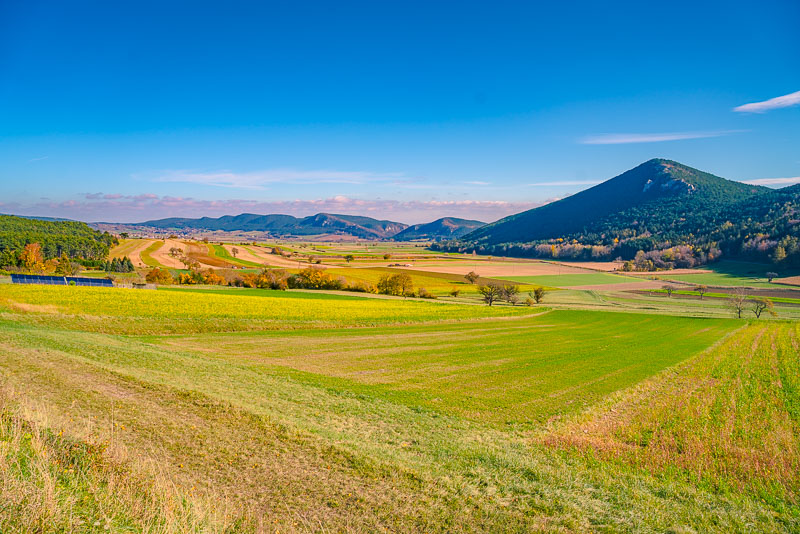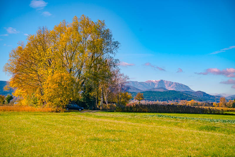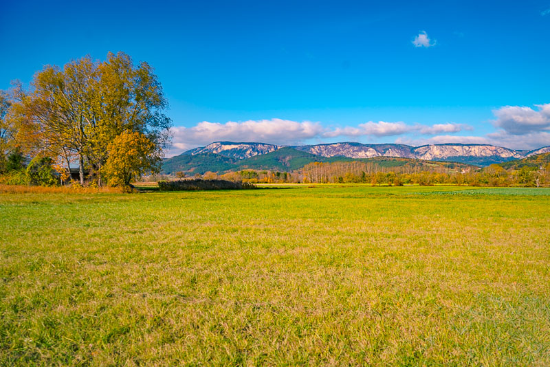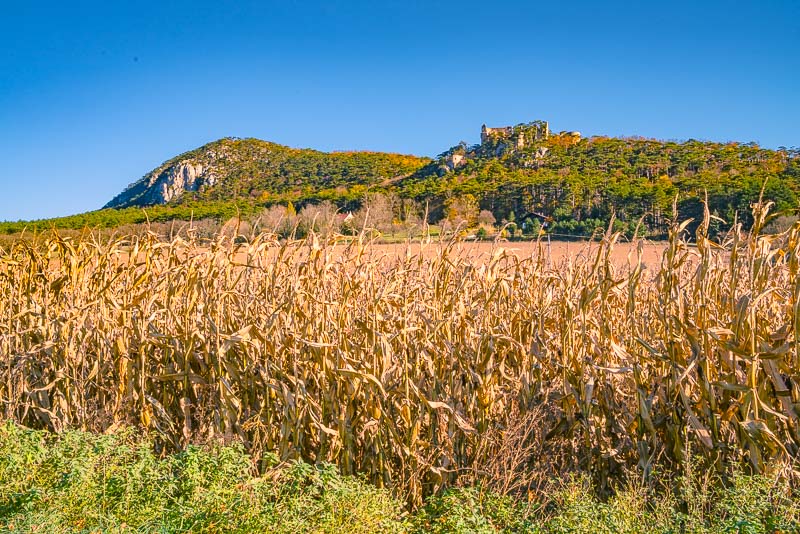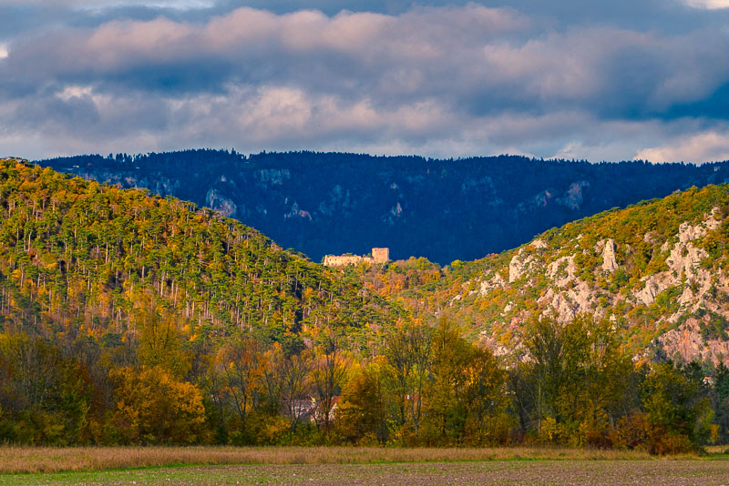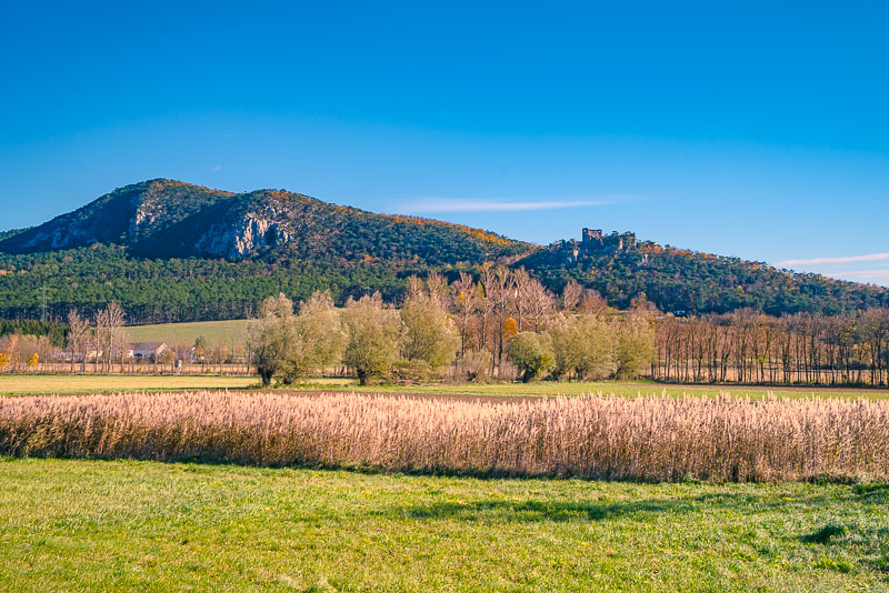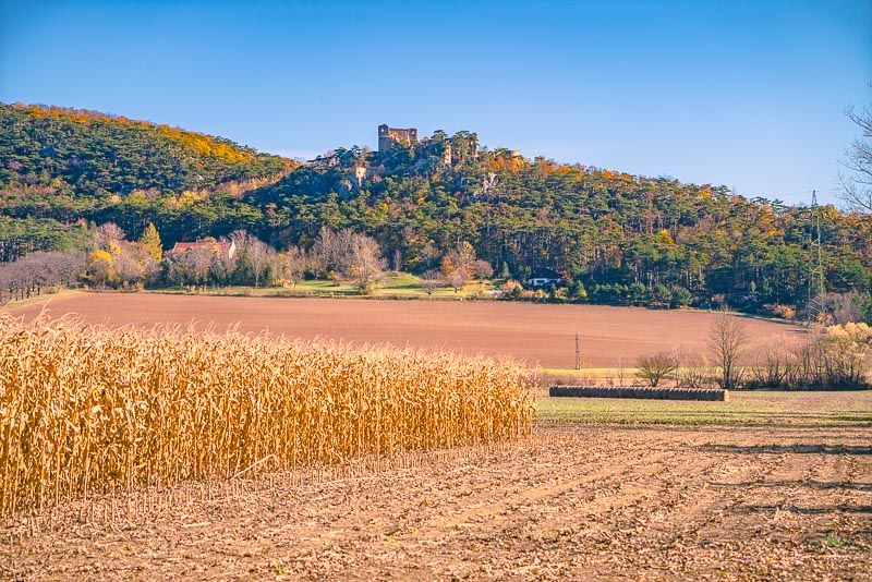 Riding now with my mountainbike through Weikersdorf and branching off to the fields heading for Willendorf. Ruin Emmerberg nicely depictured in front of the shady Hohe Wand.